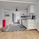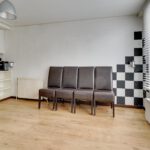 Eerste Verdieping; Overloop met trapopgang naar de bovenste verdieping en een zijdeur. De zijdeur geeft toegang tot het appartement op de eerste verdieping. Dit appartement bestaat uit een woonkamer met een open keuken, een open toegang tot de werkkamer, een slaapkamer en een badkamer. De keuken is voorzien van diverse inbouwapparatuur, waaronder een Quooker en de badkamer beschikt over een toilet, een wastafel en een ligbad/douche-combinatie.