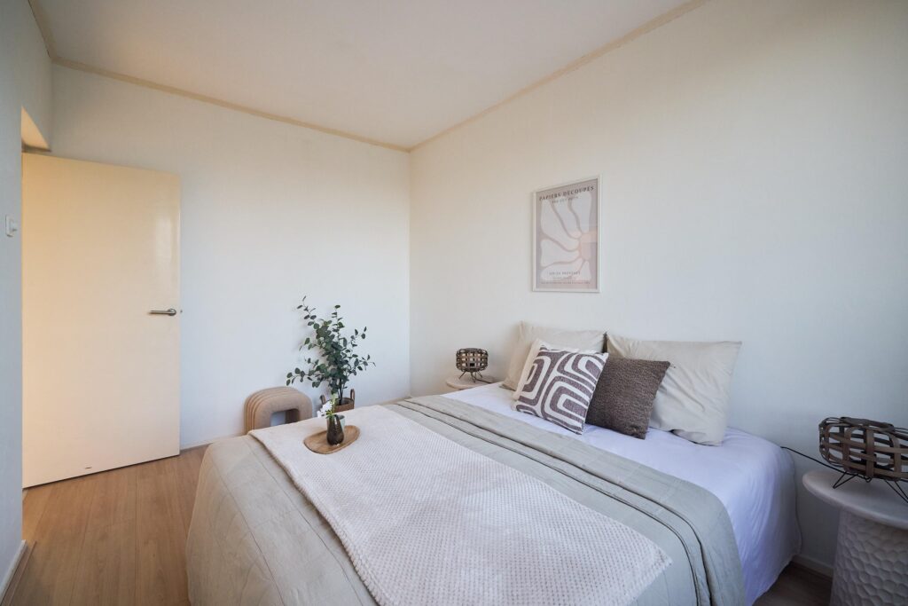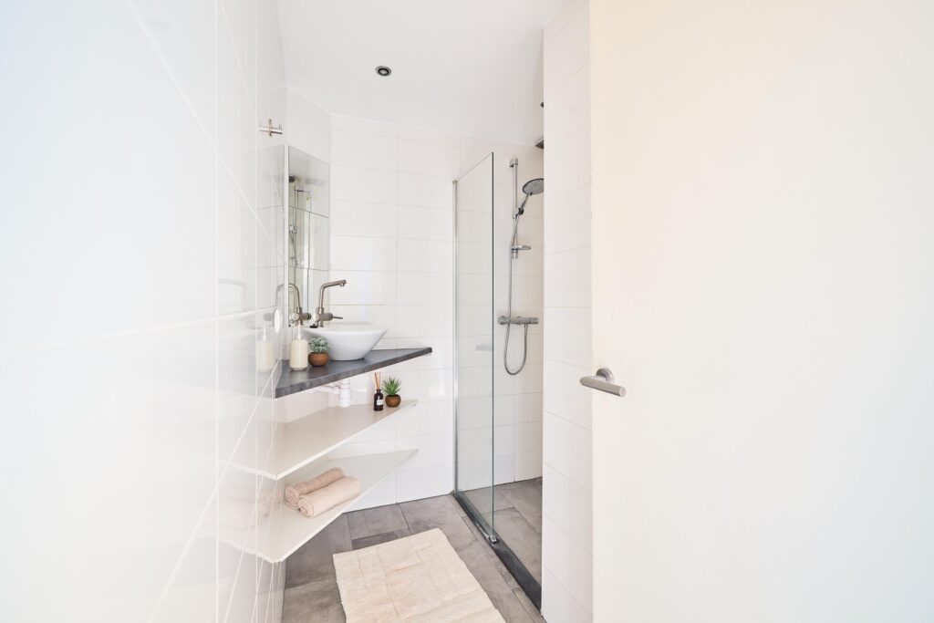 De hal leidt verder naar toilet, badkamer, keuken en de slaapkamers. De badkamer is uitgerust met een wastafelmeubel en inloopdouche. De slaapkamers liggen aan de voorzijde en kijken uit over de rustige straat.