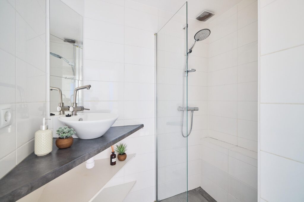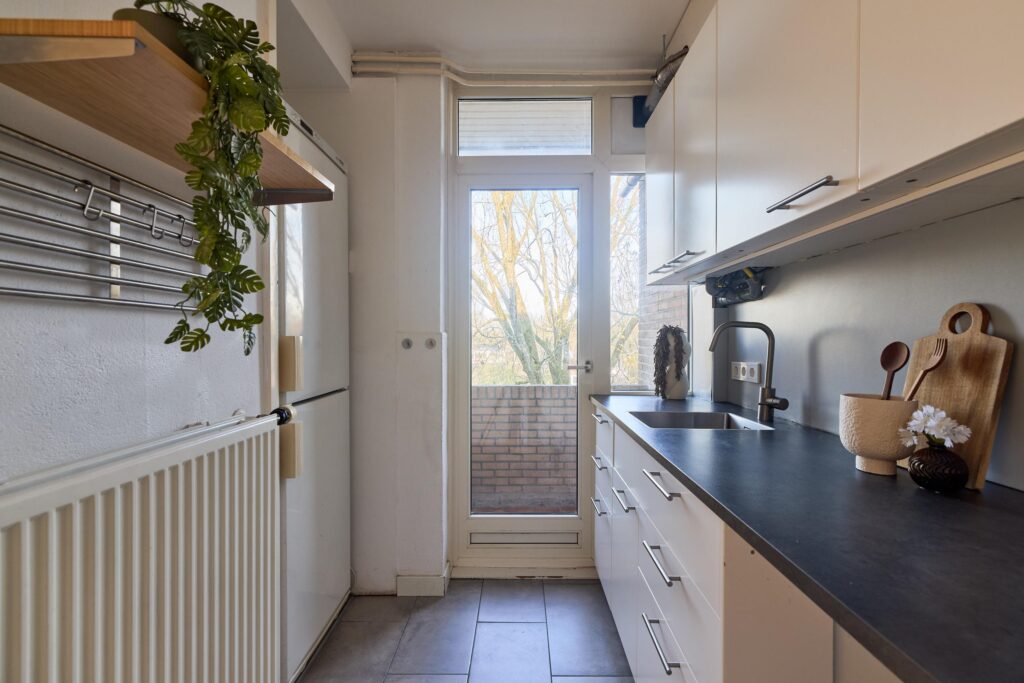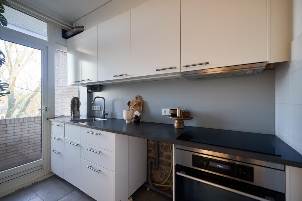 De keuken is modern en compleet, voorzien van inductiekookplaat, combi-oven, royale koel-/vriescombinatie en een wasmachineaansluiting. De CV opstelling is netjes weggewerkt.