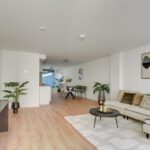 Doorzon woonkamer met doorgelegde vloeren en een open keuken welke voorzien is van diverse inbouwapparatuur.