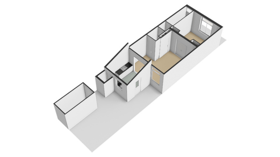 De keuken beschikt over de buitendeur naar de achtertuin. Deze is gelegen op het zuidwesten, heeft een berging en een achterom.