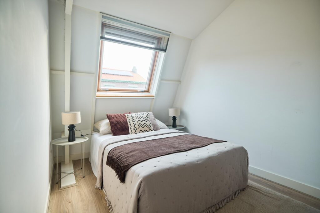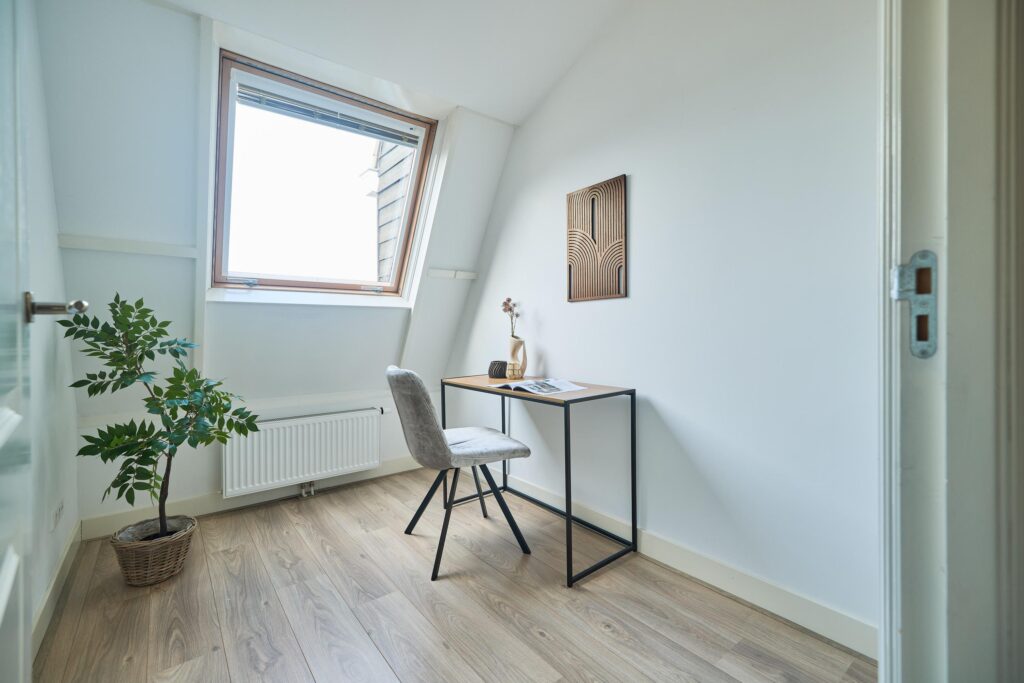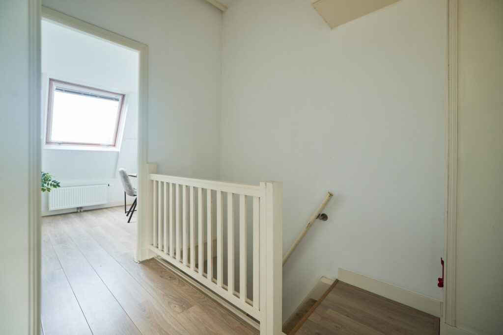 Eerste Verdieping; Overloop met toegang tot alle vertrekken, waaronder drie slaapkamers met een royaal dakraam en een badkamer. De badkamer beschikt over een tweede toilet, een douche en een wastafelmeubel.