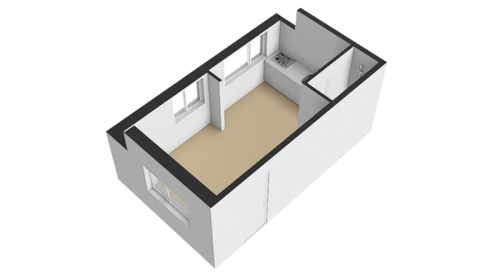De woning is praktisch opgezet en biedt alles wat je nodig hebt binnen handbereik. Dankzij de aanwezige raampartijen geniet de studio van prettig daglicht en voelt de ruimte open aan. De open keuken is langs de wand gesitueerd en biedt de benodigde aansluitingen en werkruimte. De badkamer is compact en voorzien van een douche en toilet.