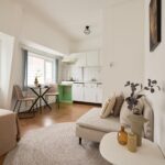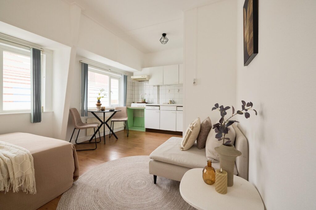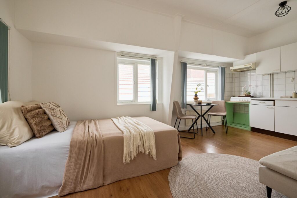 Entree, open studioruimte met woon-/slaapgedeelte en open keuken langs de wand.