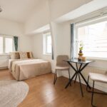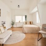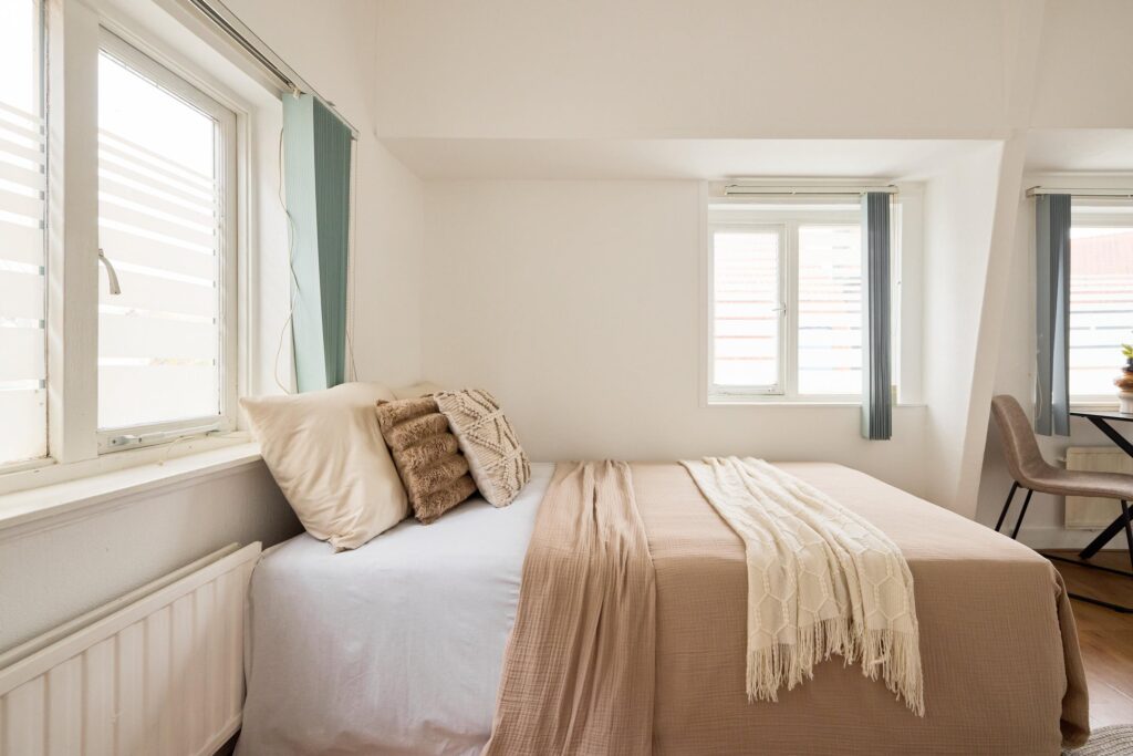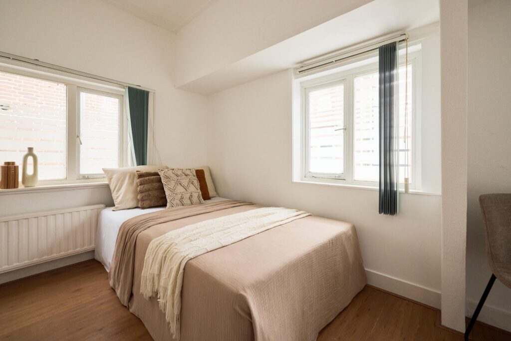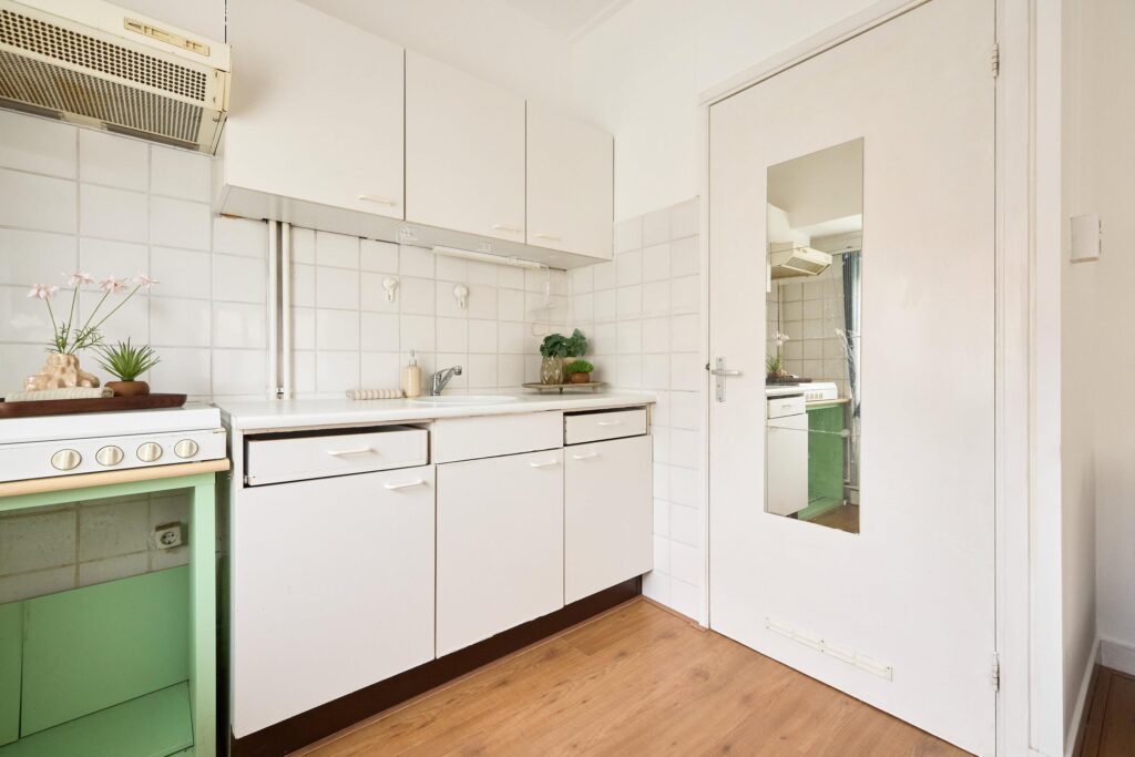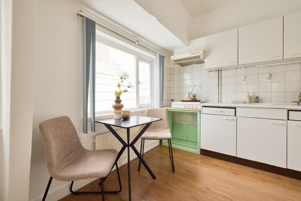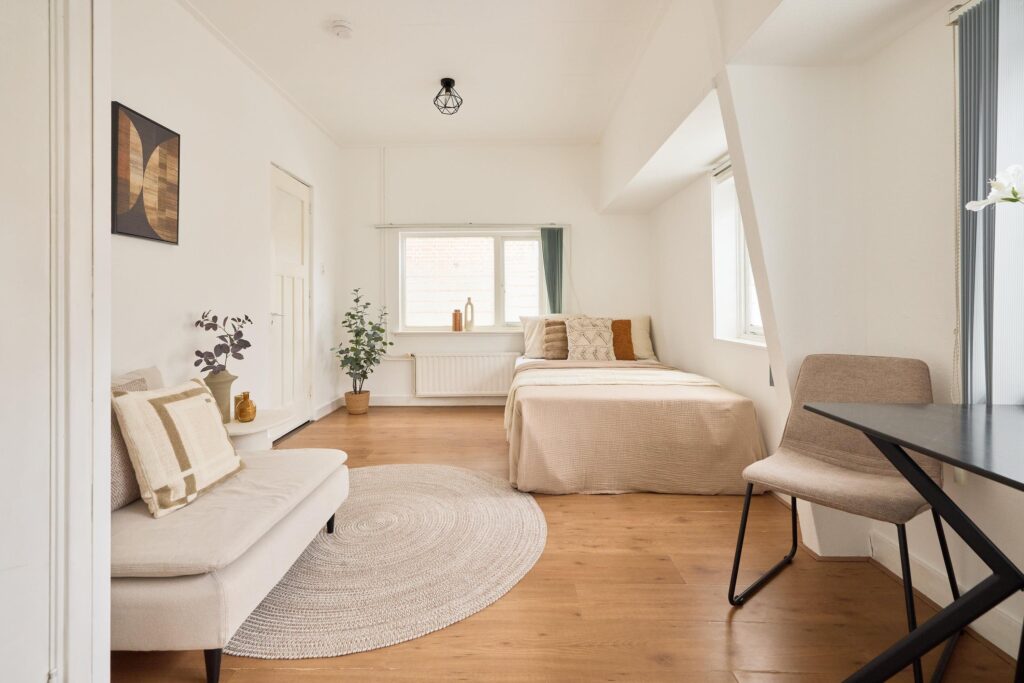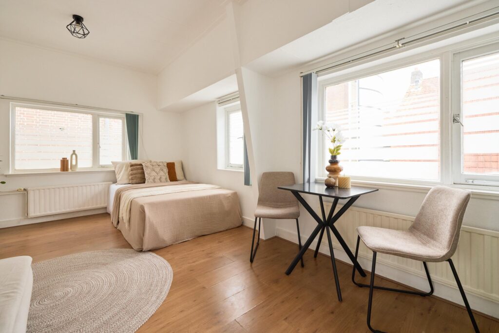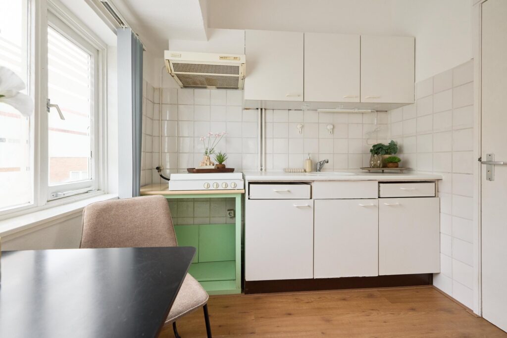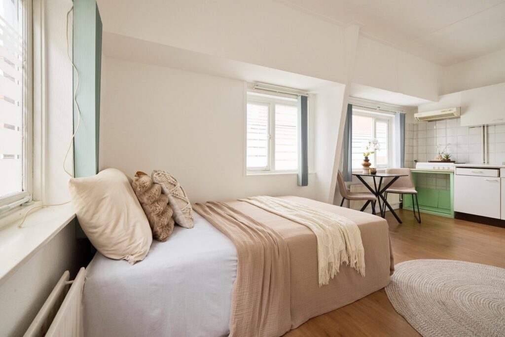 De woning is praktisch opgezet en biedt alles wat je nodig hebt binnen handbereik. Dankzij de aanwezige raampartijen geniet de studio van prettig daglicht en voelt de ruimte open aan. De open keuken is langs de wand gesitueerd en biedt de benodigde aansluitingen en werkruimte. De badkamer is compact en voorzien van een douche en toilet.