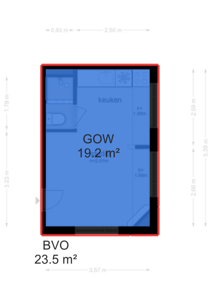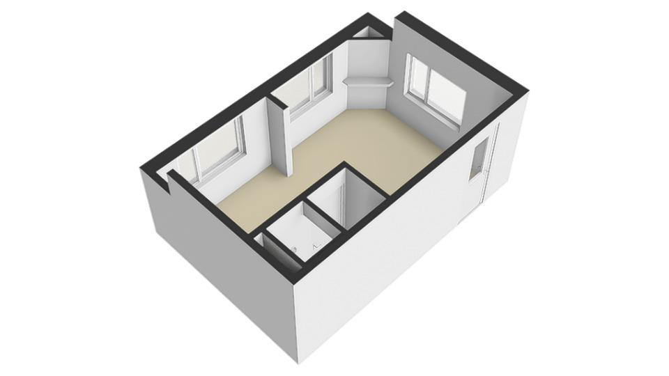 Entree, open studio-ruimte met woon-/slaapgedeelte en open keuken langs de wand. De badkamer is compact en voorzien van douche en toilet. De ruimte is efficiënt in te delen met een zitgedeelte en slaapgedeelte.