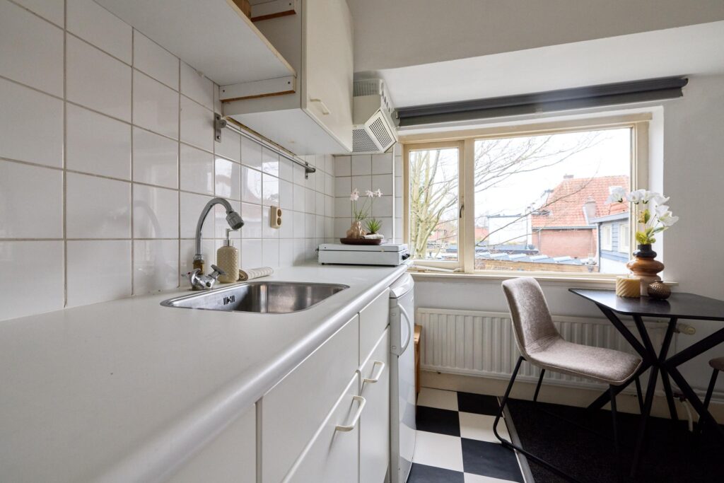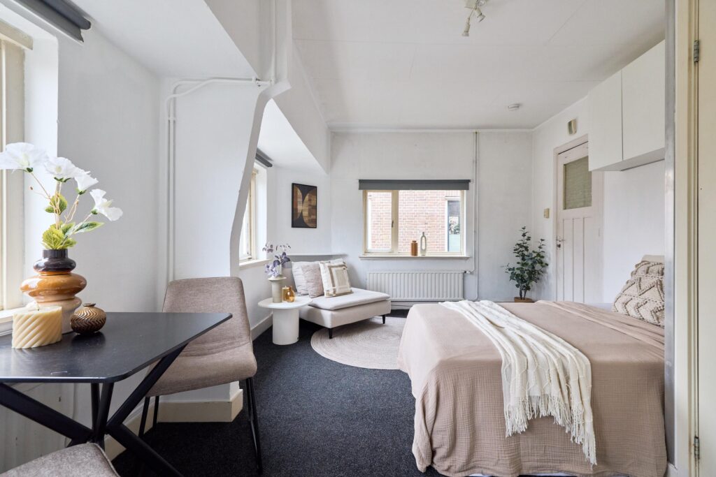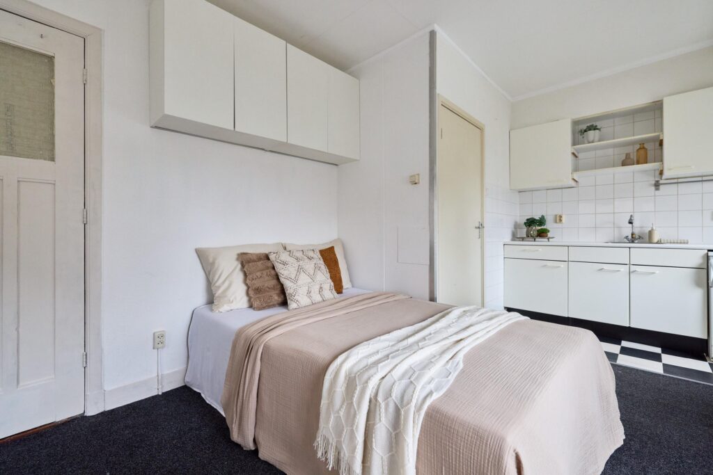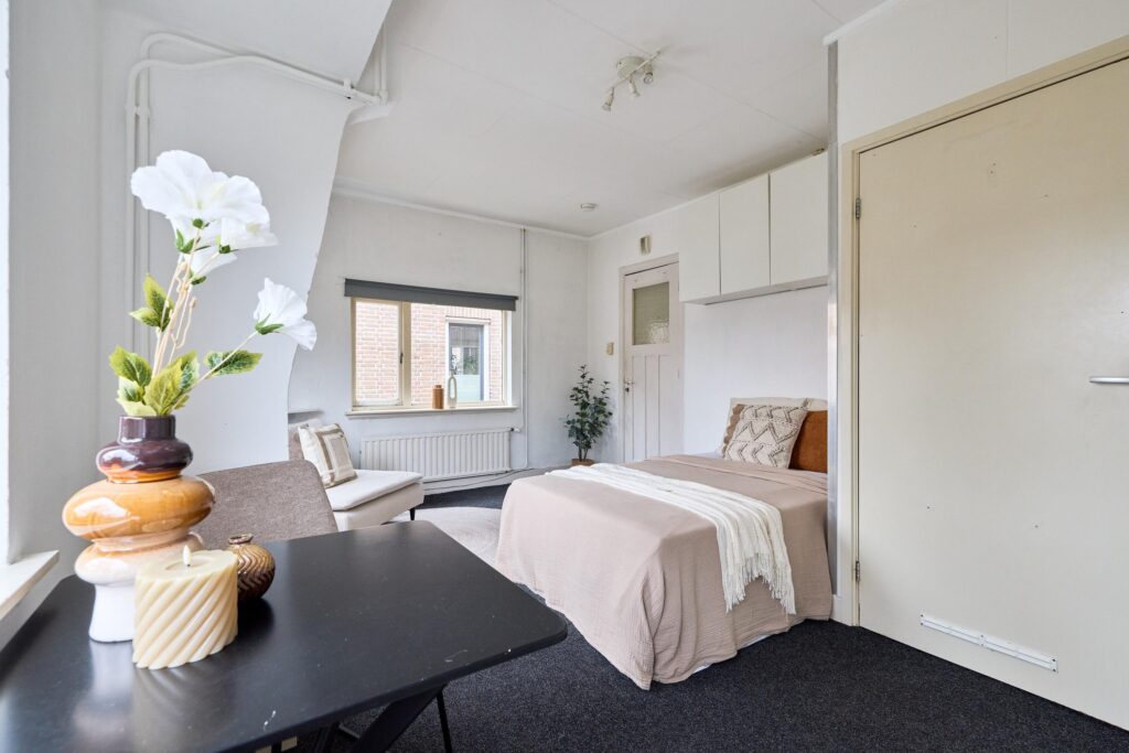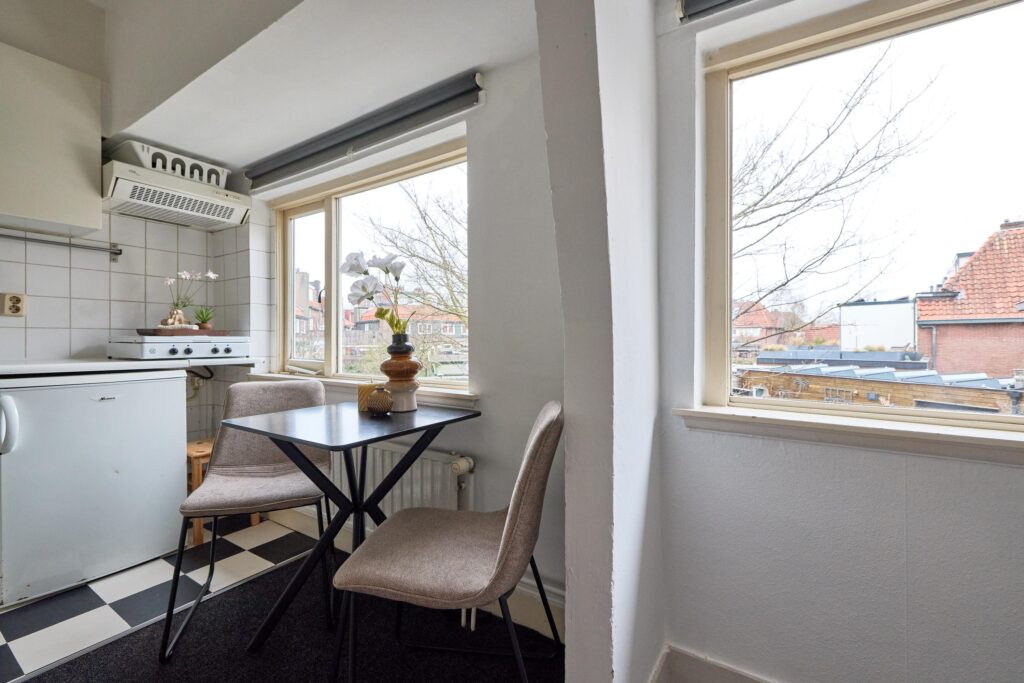 De woning is praktisch opgezet en biedt alles wat je nodig hebt binnen handbereik. Dankzij de prettige lichtinval en slimme indeling voelt de studio verrassend ruim aan. De open keuken is gesitueerd langs de wand en voorzien van de benodigde aansluitingen en werkruimte. De badkamer beschikt over een douche en toilet.
