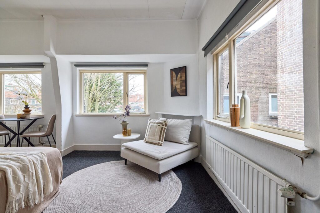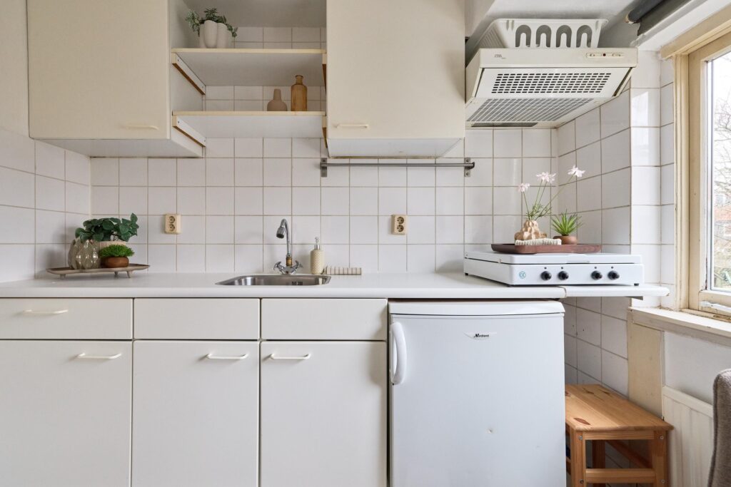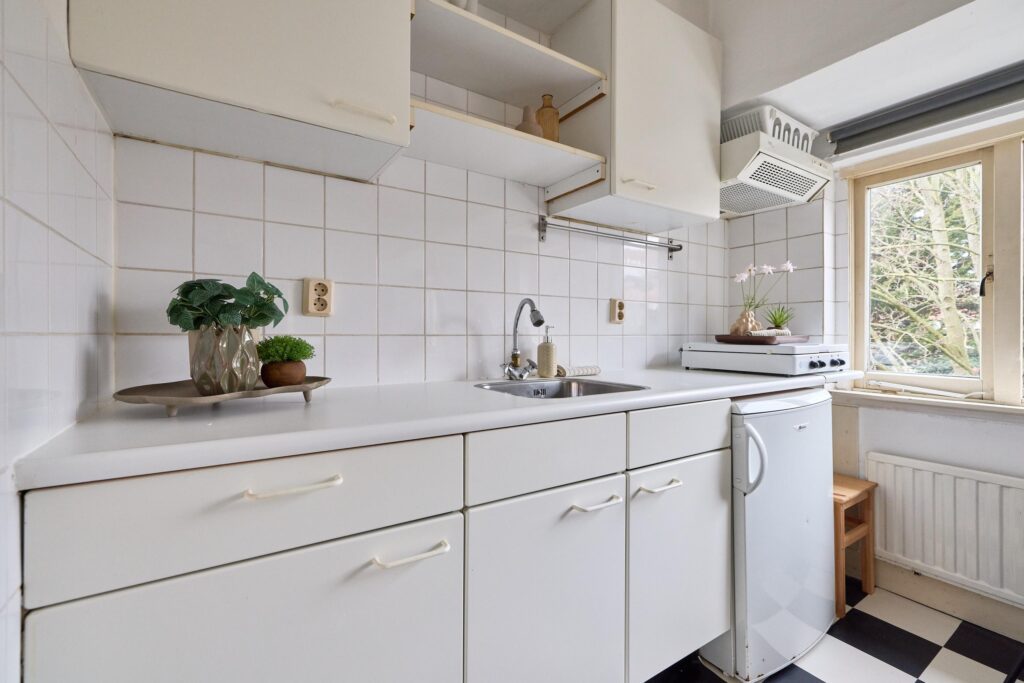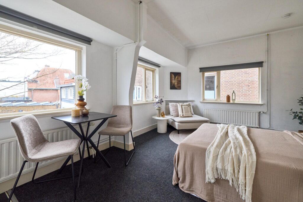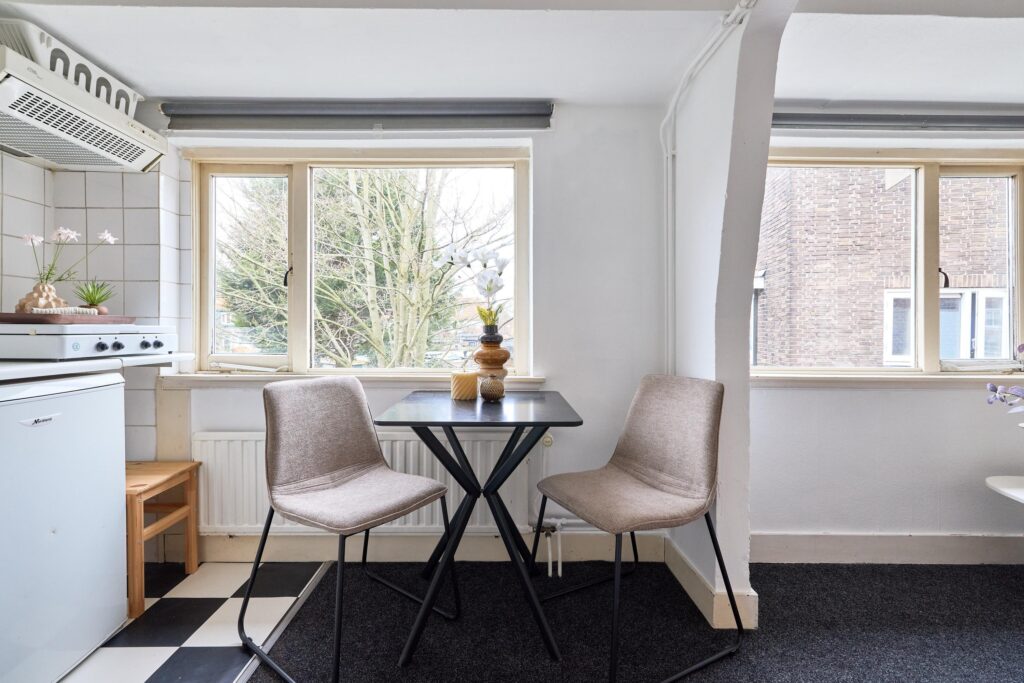 De woning is praktisch opgezet en biedt alles wat je nodig hebt binnen handbereik. Dankzij de prettige lichtinval en slimme indeling voelt de studio verrassend ruim aan. De open keuken is gesitueerd langs de wand en voorzien van de benodigde aansluitingen en werkruimte. De badkamer beschikt over een douche en toilet.