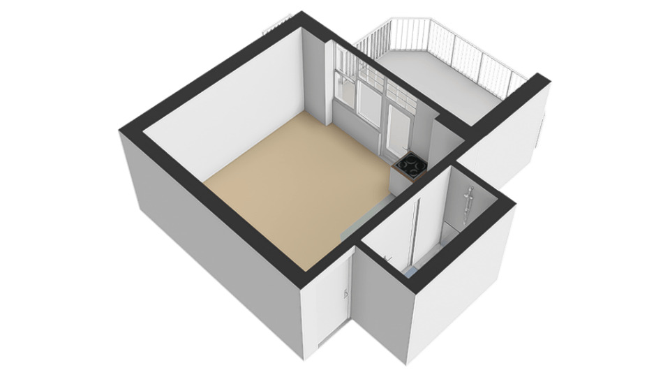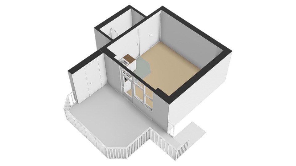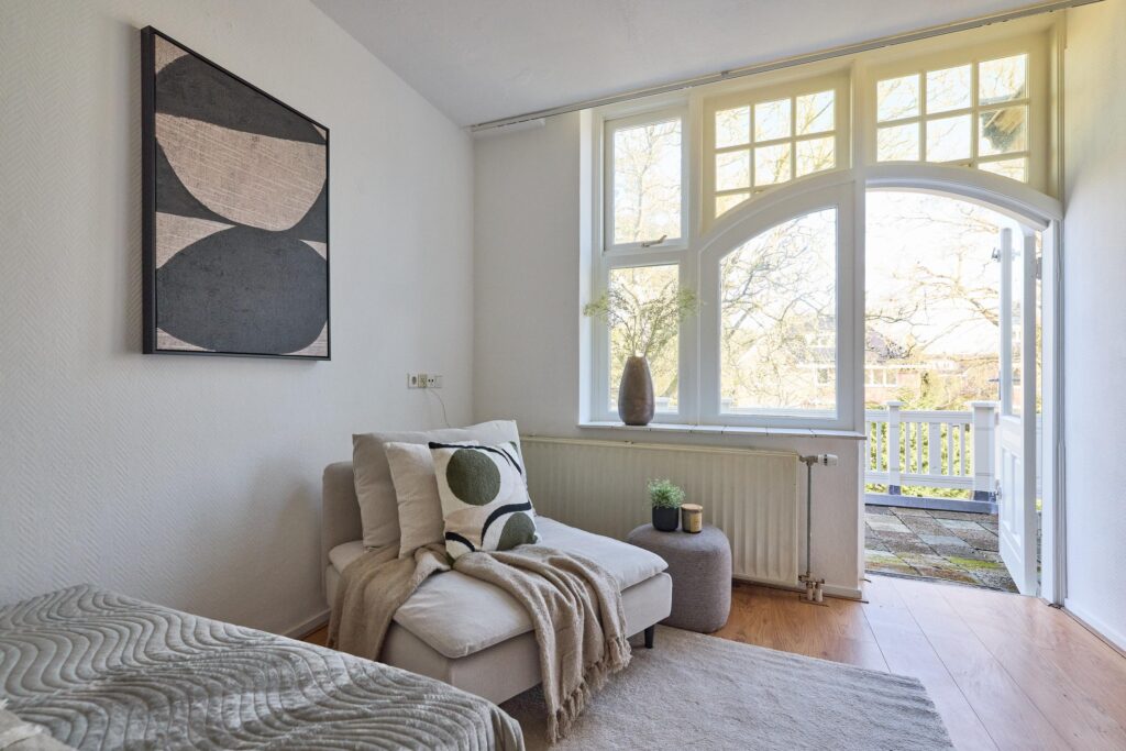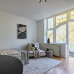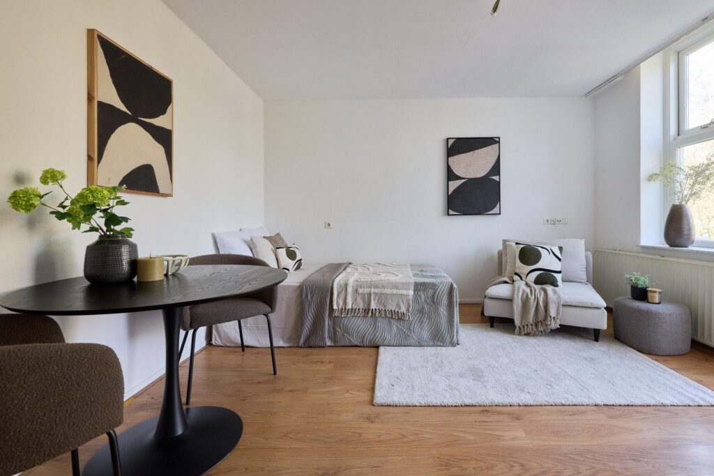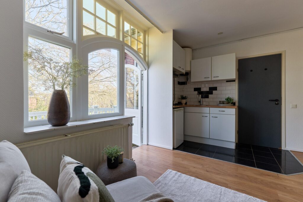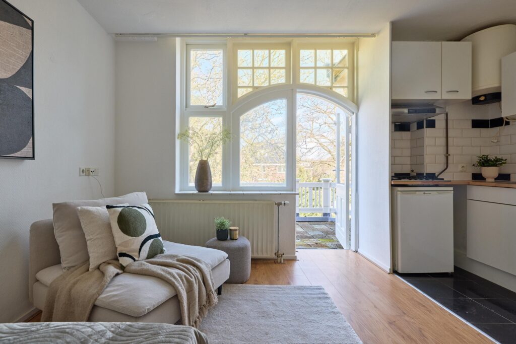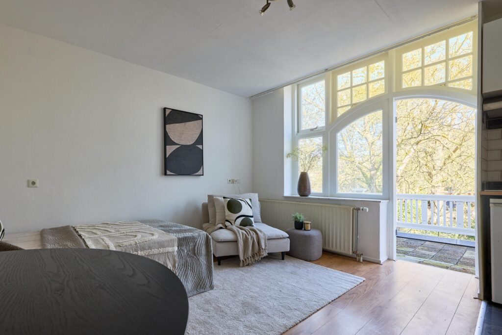 De studio beschikt over een lichte woon-/slaapruimte met grote raampartijen en openslaande deuren naar het ruime balkon. Hierdoor geniet de woning van veel natuurlijk licht en een prettig uitzicht op het groen. Het balkon vormt een heerlijke plek om buiten te zitten en te ontspannen.