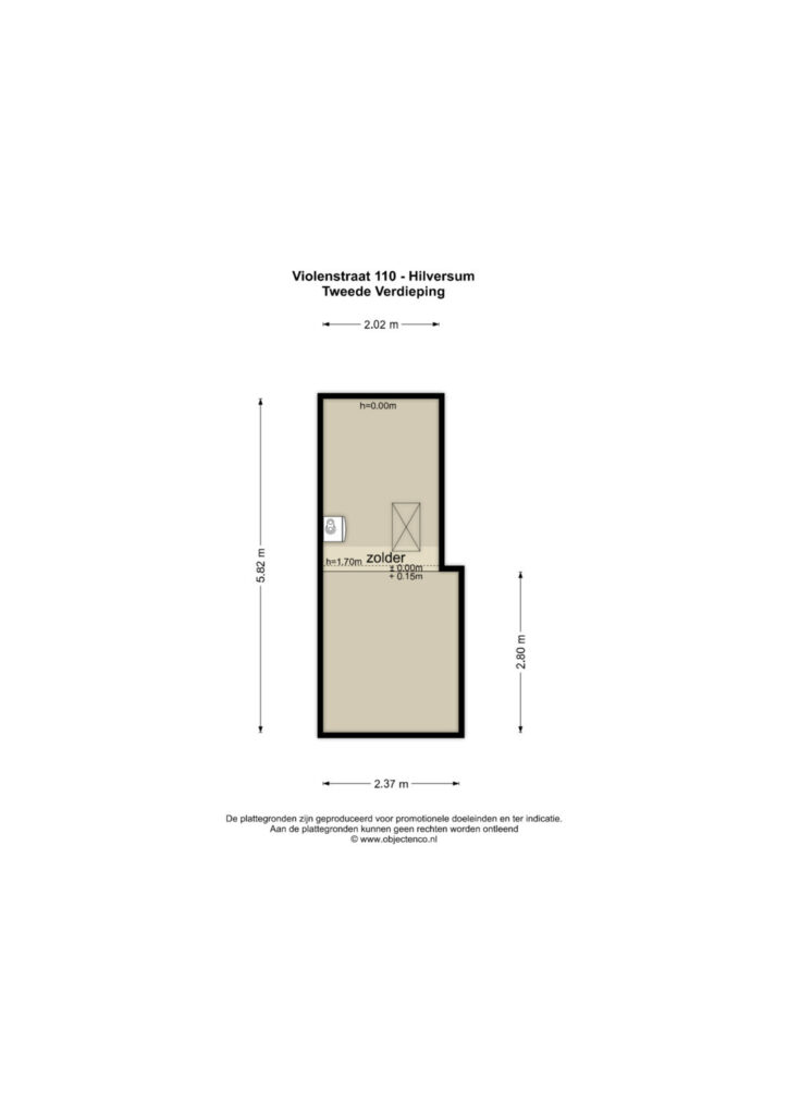 Tweede verdieping; Deze verdieping is bereikbaar via de vlizotrap en heeft in het midden een hoogte van circa 1,70 meter. Hier bevindt zich tevens de opstelling van de cv installatie.