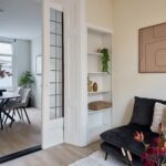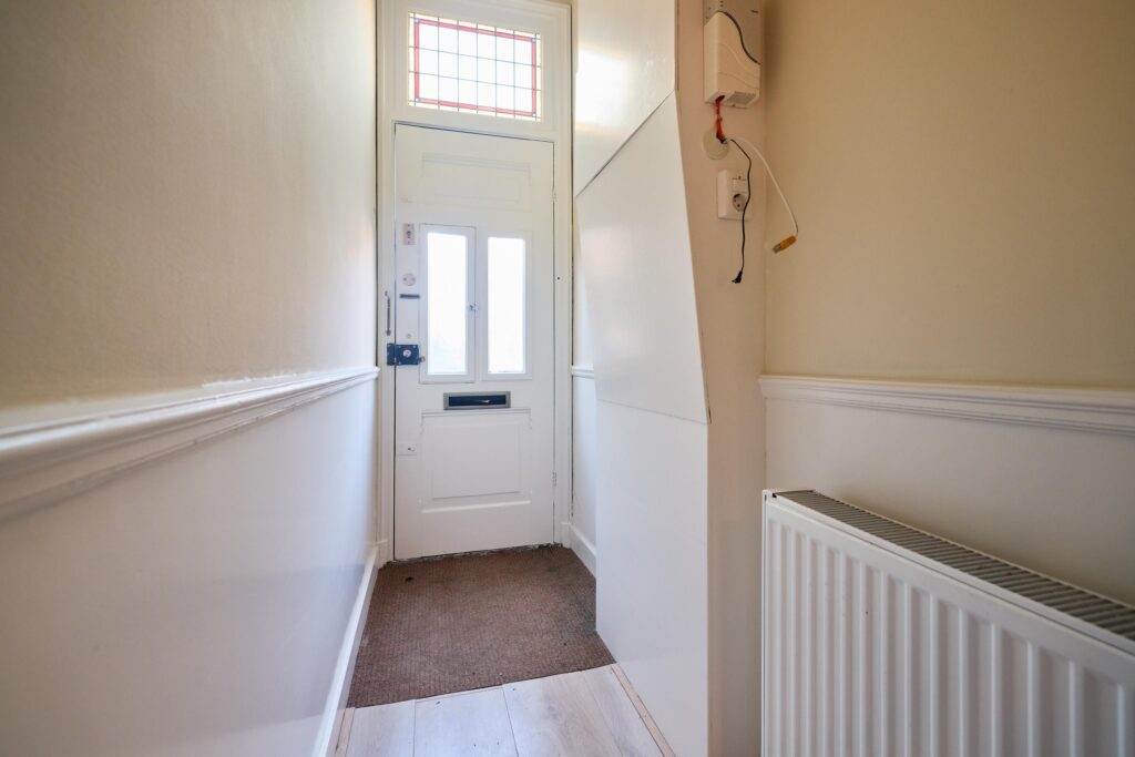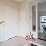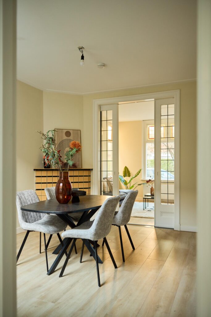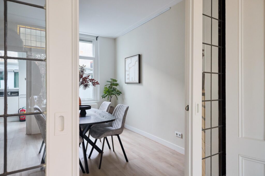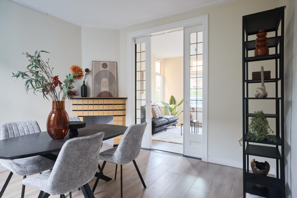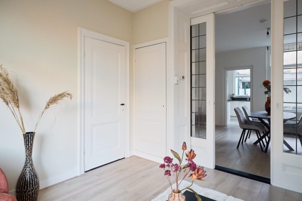 Vanuit de woonkamer leidt een deur naar de trapopgang naar de eerste verdieping.