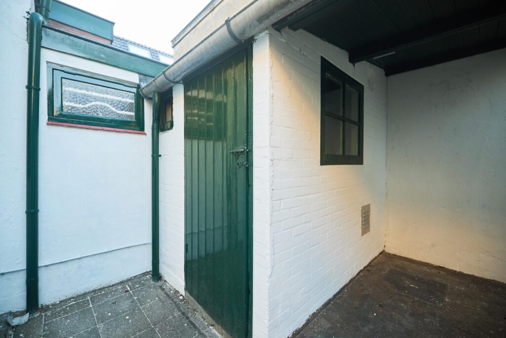 Aan de achterzijde bevindt zich de open doorgang naar de keuken, die is verdeeld in drie compartimenten. De keuken beschikt over een inbouwkast, een fraaie kookschouw en diverse inbouwapparatuur. Vanuit de keuken is er toegang tot de achtertuin. De tuin loopt langs de voorzijde, zijflank en achterzijde van de woning en beschikt over een zijpoort. De achtertuin is gelegen op het zonnige zuiden en biedt ruimte aan een afgesloten berging en een overkapping.