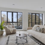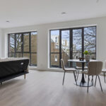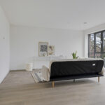 De royale woonkamer van circa 35 m² beschikt over dubbele openslaande deuren met Frans balkon. Grote raampartijen zorgen voor veel daglicht. De vloer is afgewerkt met laminaat en voorzien van vloerverwarming (in een zwevende geïsoleerde dekvloer).