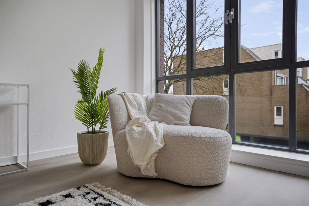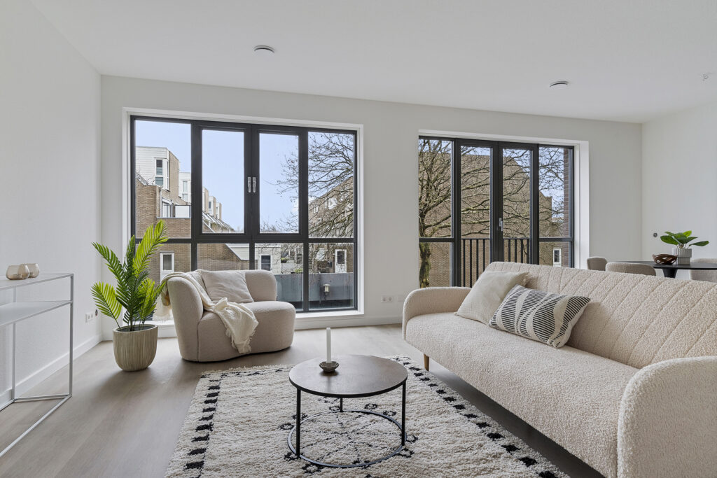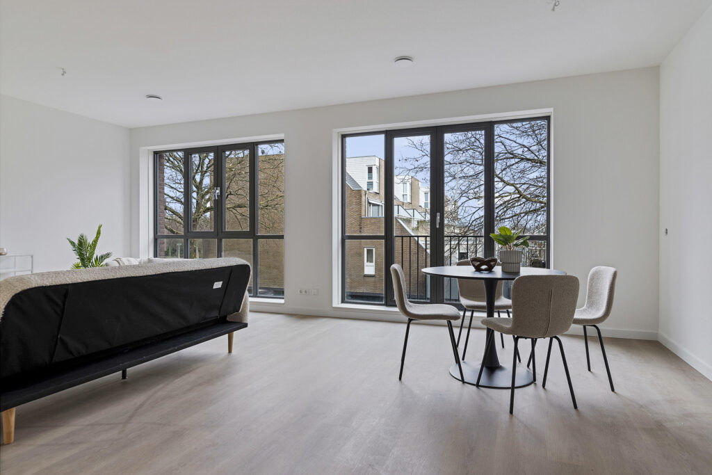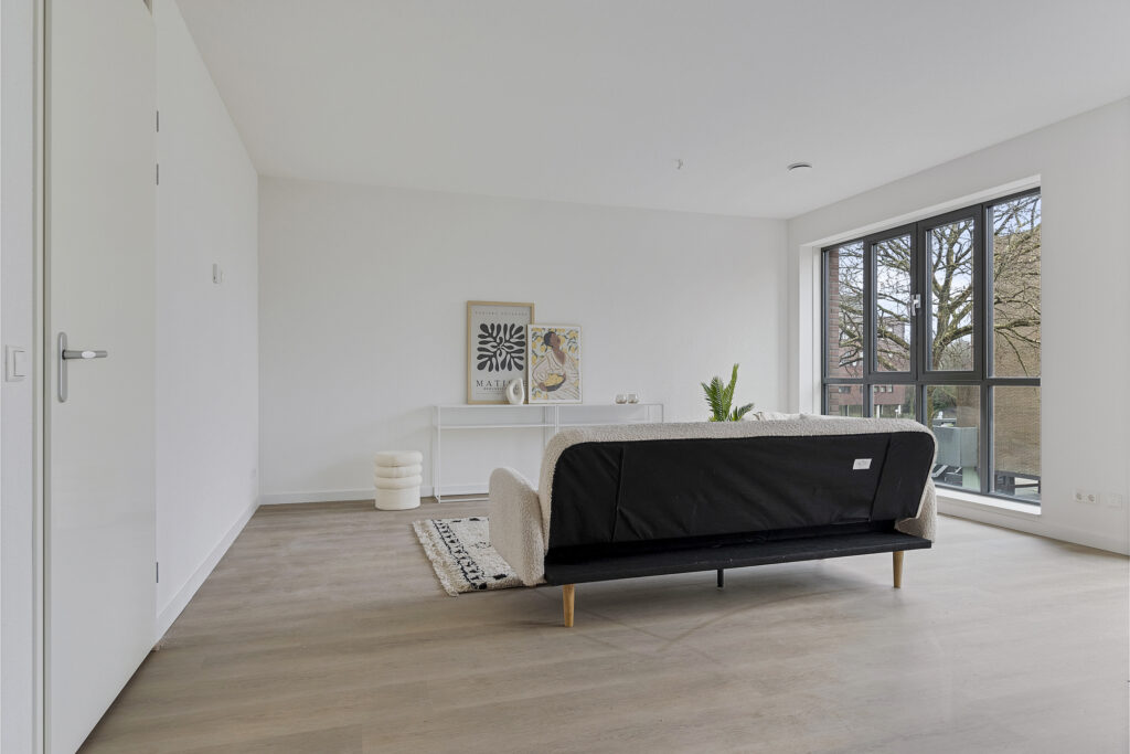 De royale woonkamer van circa 35 m² beschikt over dubbele openslaande deuren met Frans balkon. Grote raampartijen zorgen voor veel daglicht. De vloer is afgewerkt met laminaat en voorzien van vloerverwarming (in een zwevende geïsoleerde dekvloer).