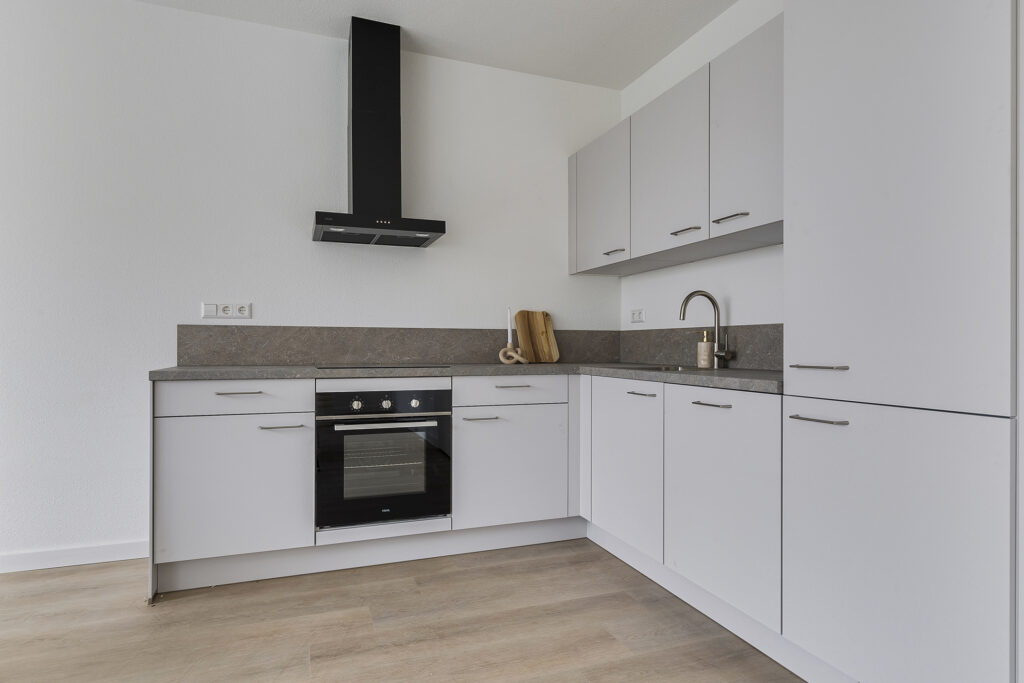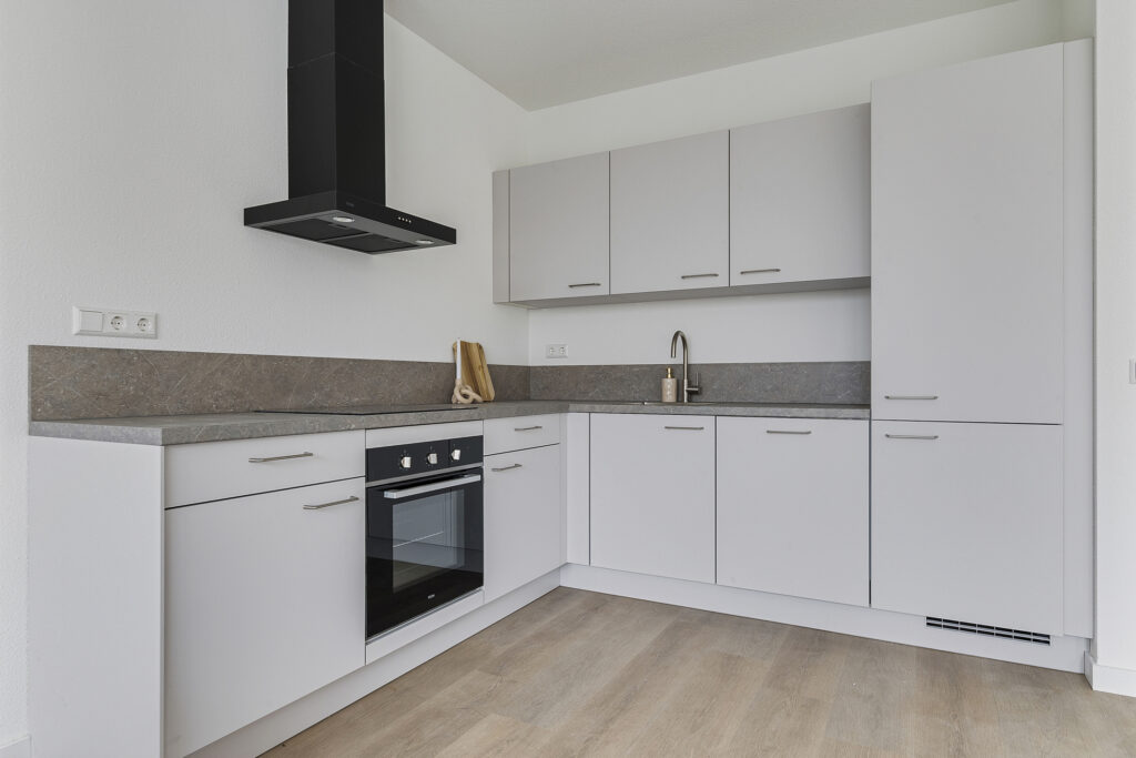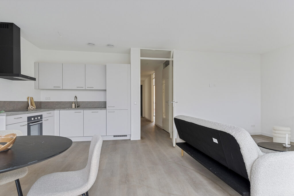 De open keuken is uitgerust met een inductiekookplaat, afzuigkap, combi-oven, vaatwasser, koelkast en vriesvak. Er is ruimte voor een ruime eettafel – ideaal voor etentjes en gezellige avonden.