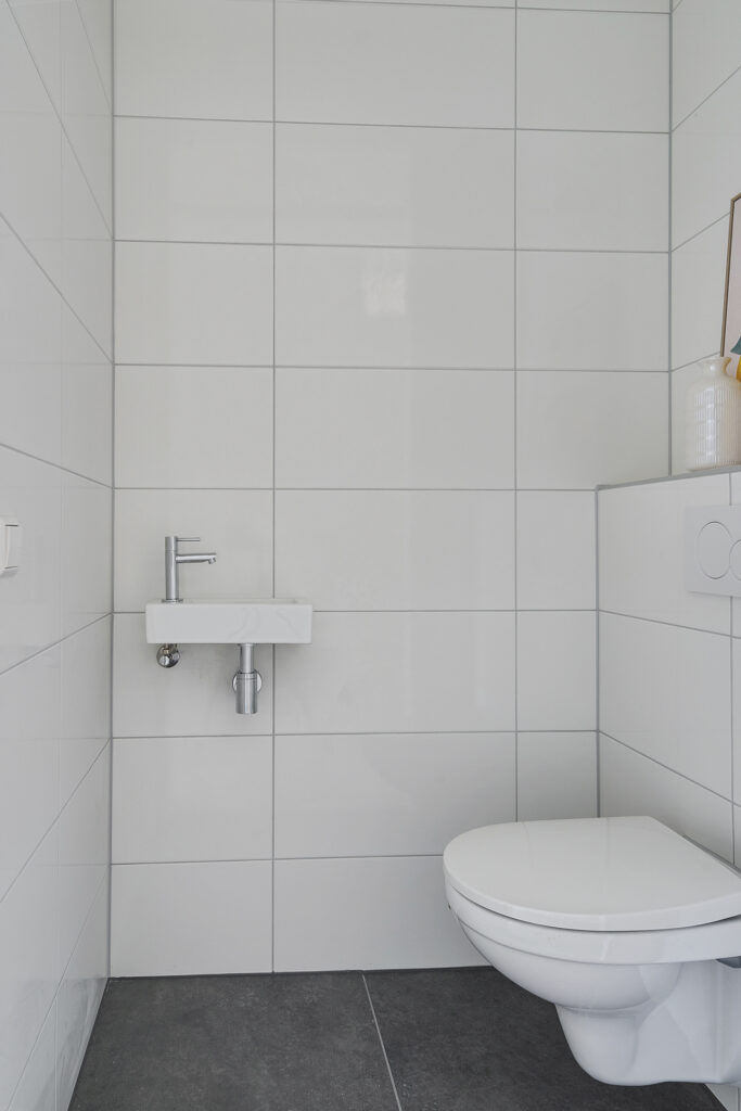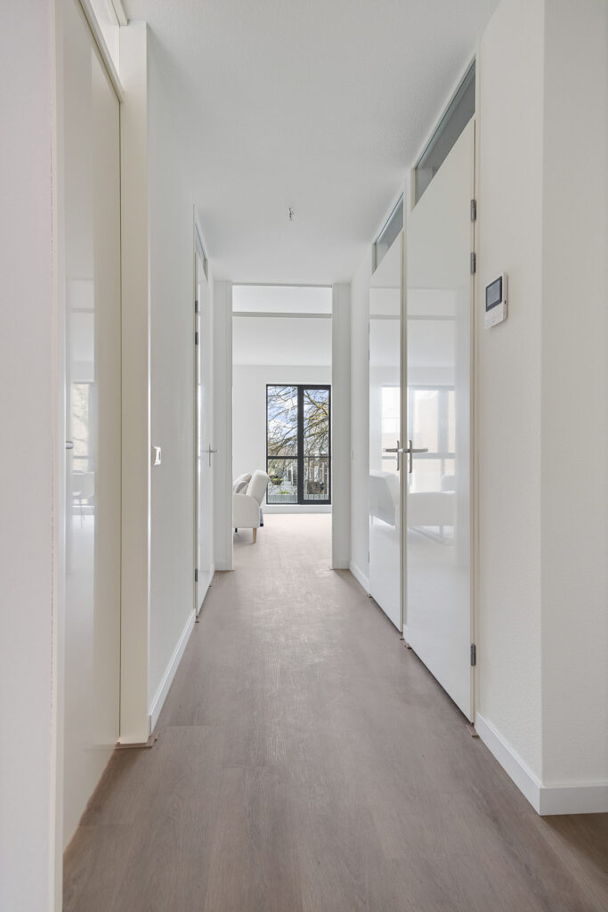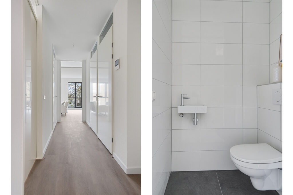 Via trap of lift bereikt u de tweede verdieping. In de hal van het appartement bevinden zich de meterkast (met glasvezel), een separaat toilet met fonteintje, en toegang tot alle vertrekken.