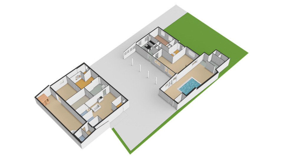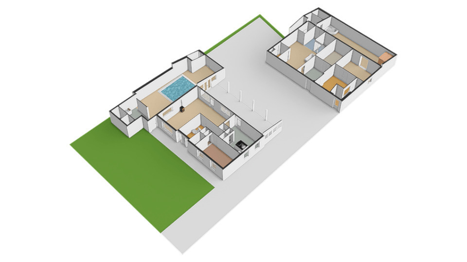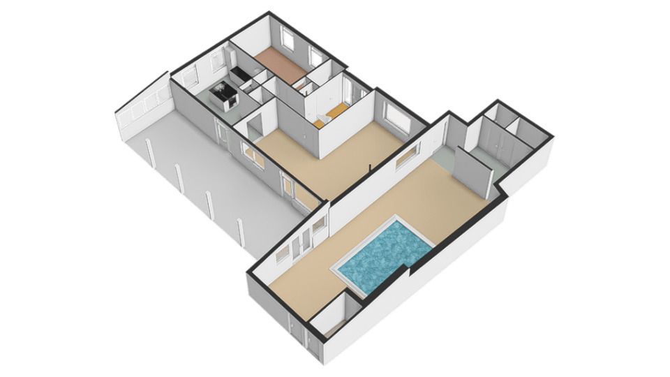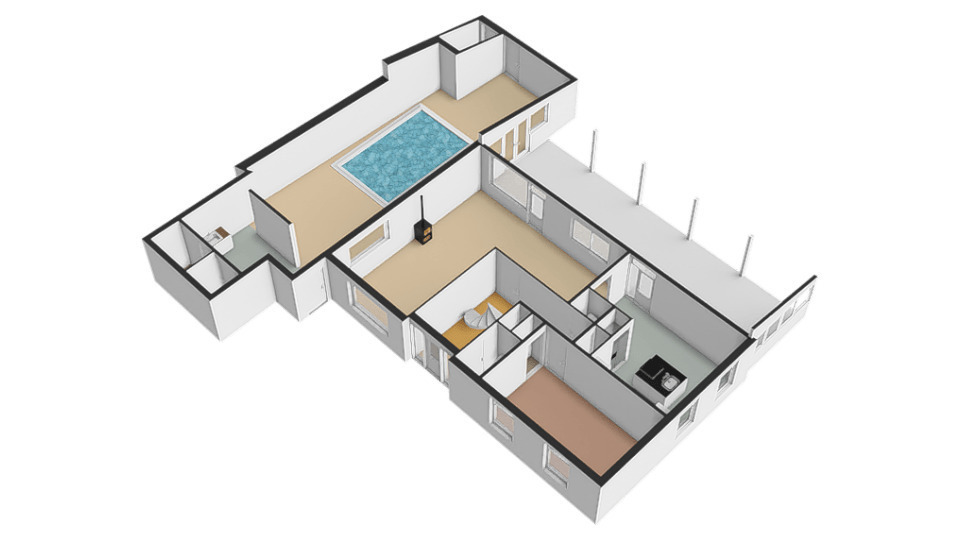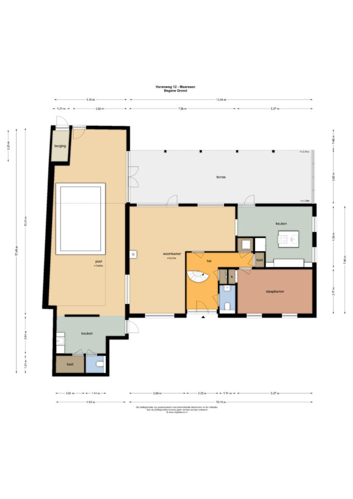 Begane Grond; Entree, hal met draaitrap, meterkast, inbouwkast en een afgesloten berging met wasmachine-aansluiting. Vanuit de hal is er toegang tot de slaapkamer en de doorzon woonkamer met een sfeervolle houtkachel en toegang tot het overkapte terras. De woonkamer is gesitueerd in een L-vorm en heeft een open doorgang naar de keuken. Deze keuken biedt tevens toegang tot het terras en beschikt over o.a. een kook/spoel-eiland en is voorzien van diverse inbouwapparatuur. Vanuit het terras is er middels twee openslaande deuren toegang tot de ruimte met het binnenzwembad. Het zwembad heeft nog een directe toegang aan de voorzijde en een derde toegang aan de achterzijde. Hier ligt een tweede keuken welke voorzien is van apparatuur. Een separaat toilet met fontein en een afgesloten berging zijn ook gelegen aan de achterzijde. Aan de voorzijde, naast de directe toegang tot het zwembad is een afgesloten berging aanwezig.