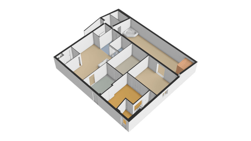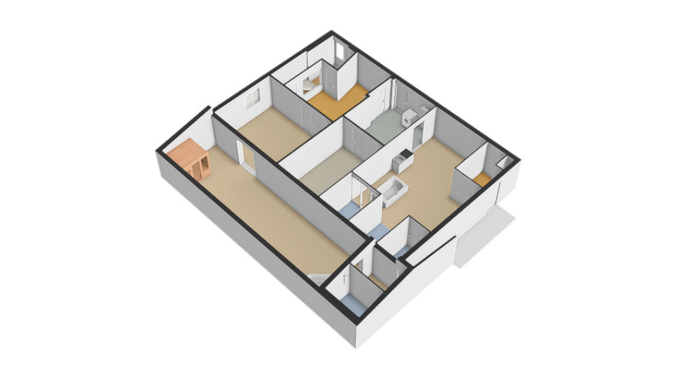 Een eerste entree komt uit in een voorportaal met een trapopgang en biedt toegang tot een royale hal. Deze hal beschikt over een trapkast en openslaande deuren naar een kamer. Deze kamer heeft een open toegang tot de zitkamer welke is voorzien van een jacuzzi, een sauna en een barok klassiek houten bargelegenheid. De zitkamer heeft een open doorgang naar een gang met een badkamer welke beschikt over een toilet, douche en wastafelmeubel. De gang heeft een kleine buitendeur die te bereiken is buitenom via een pad. Voor aan dit pad is er een entree met hal en een meterkast. Deze hal heeft ramen met uitkijk op de tweede zitkamer. Een vierder entree komt direct uit in de ruime wasruimte welke voorzien is van een c.v. installatie en een wasmachine-aansluiting. Vanuit de wasruimte is er een open toegang tot de tweede zitkamer welke voorzien is van een ligbad. De tweede zitkamer beschikt over een af te sluiten toiletruimte met een toilet en een wastafelmeubel. Daarnaast is de ruime inloopdouche gesitueerd en daarnaast staat een sauna. Vanuit de wasruimte is er toegang tot de royale berging welke is gesitueerd in het midden van het pand.