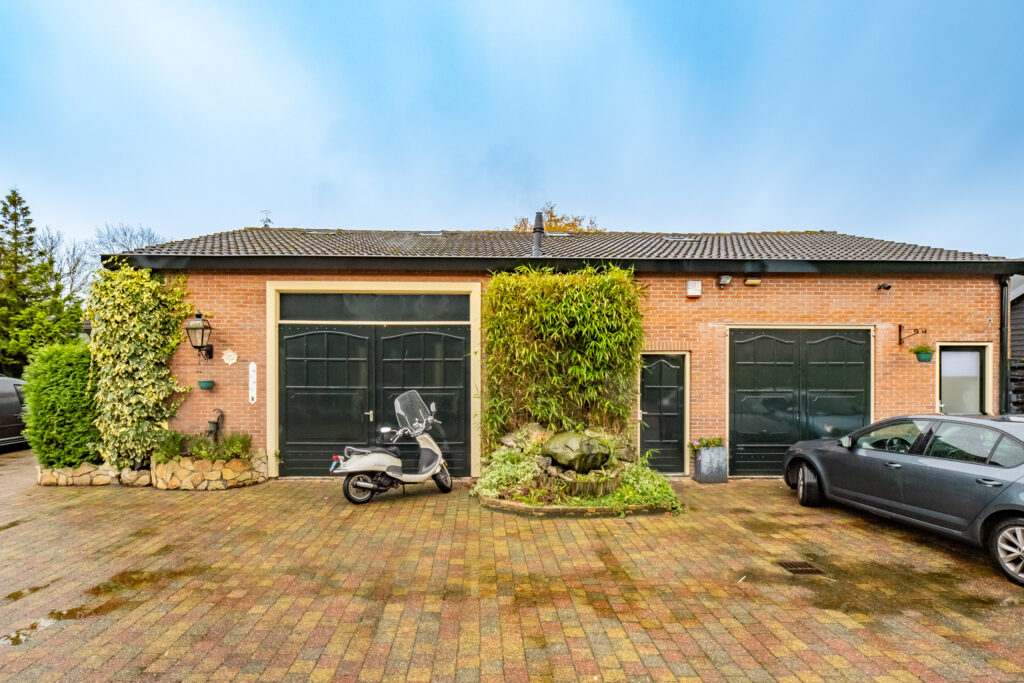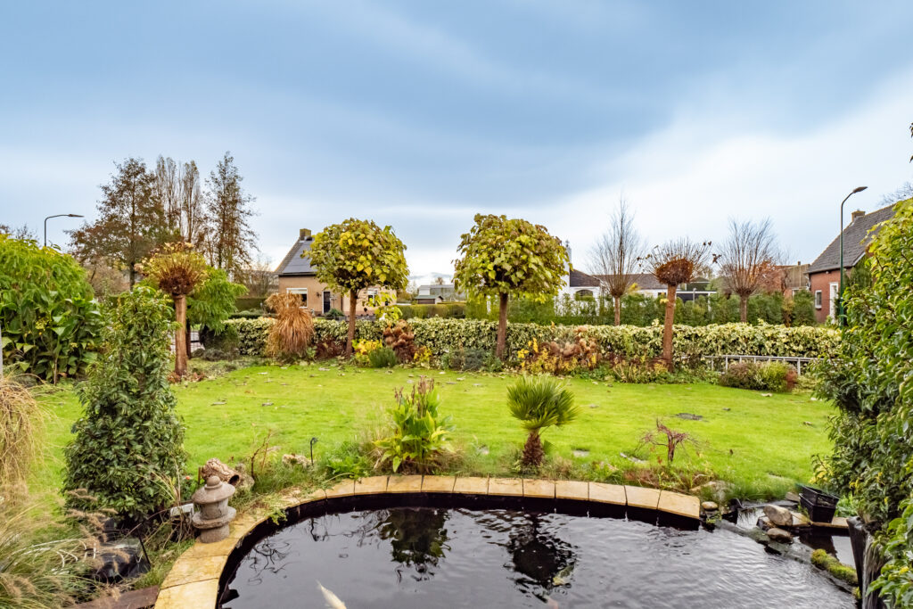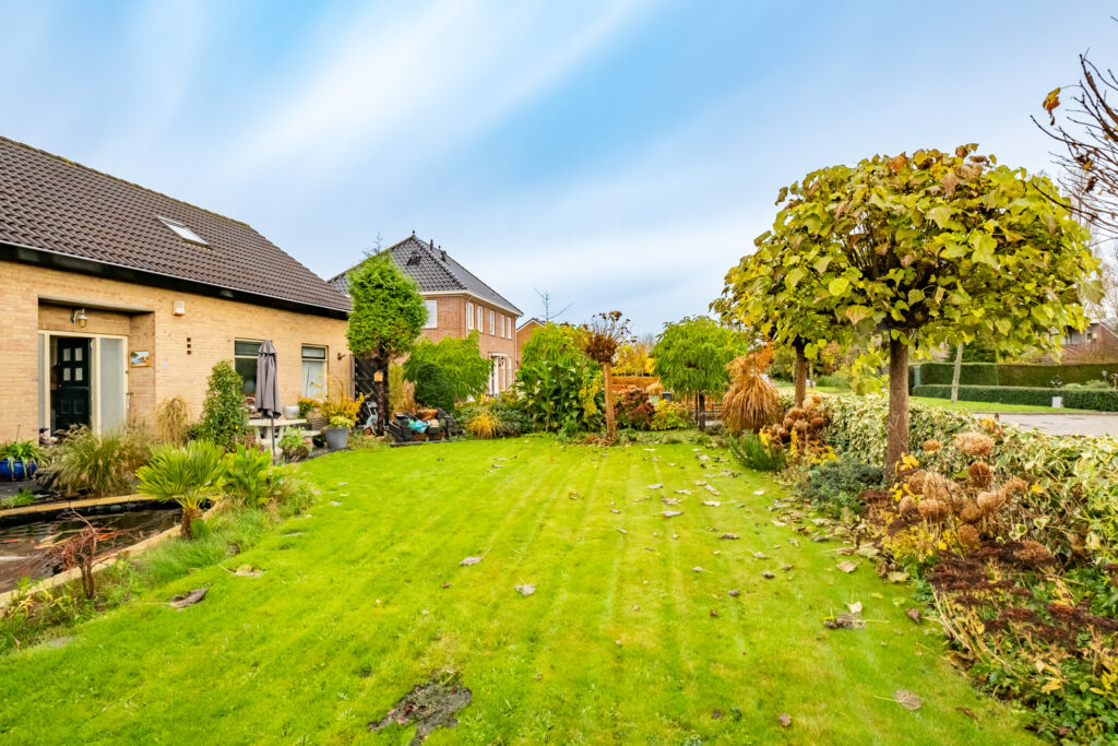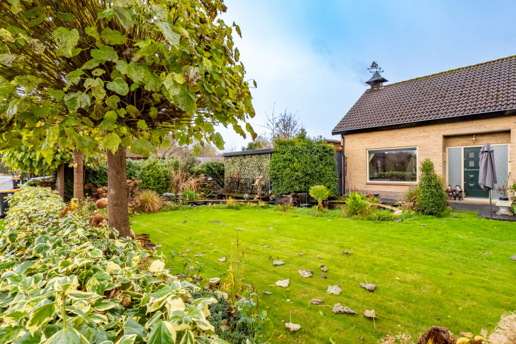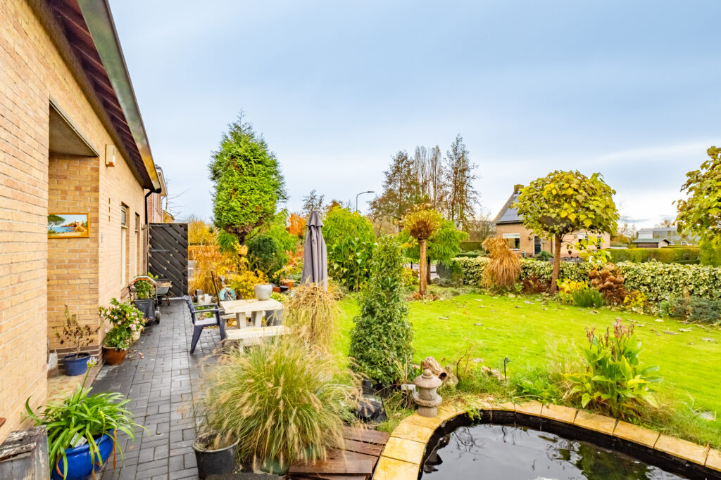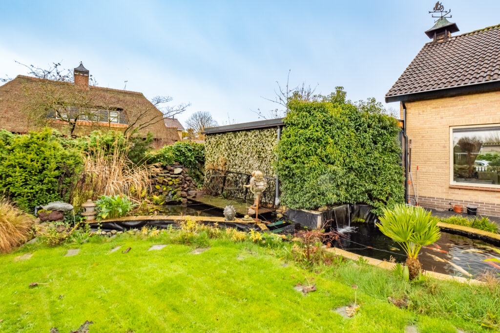 Tuin; De tuin is gelegen rondom het woonhuis en is daar voorzien van graszoden. Het overkapte terras en de oprit zijn voorzien van volledige bestrating welke doorloopt tot het bijgebouw. De voortuin beschikt over een plantsoen met beplanting en een visvijver met een brug.