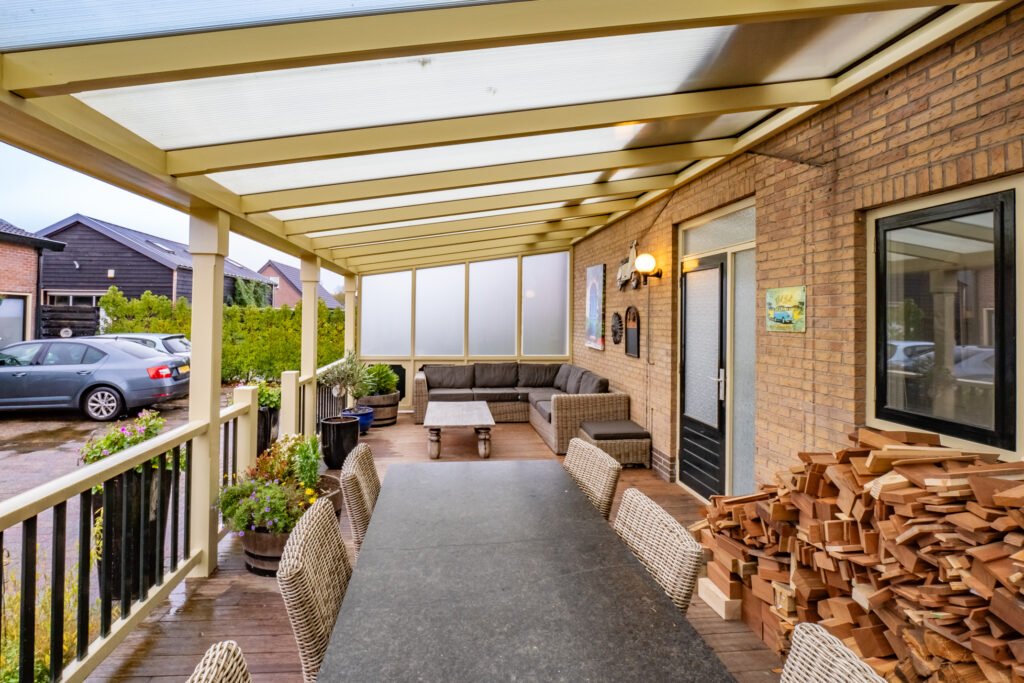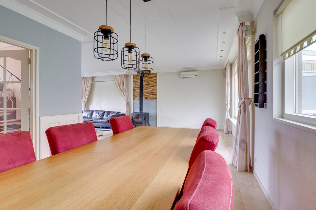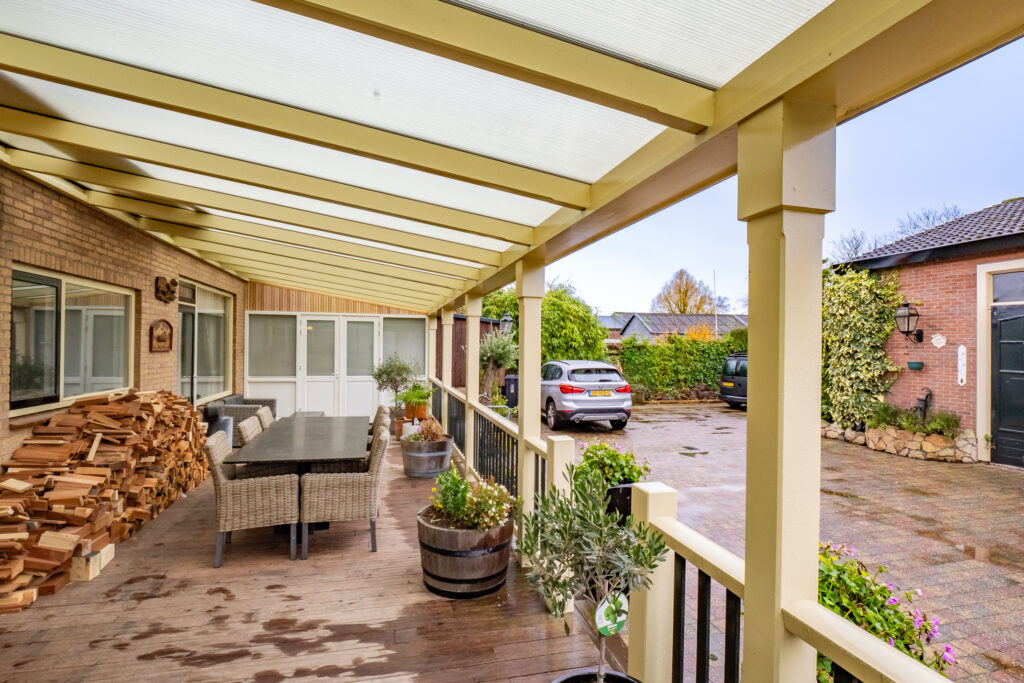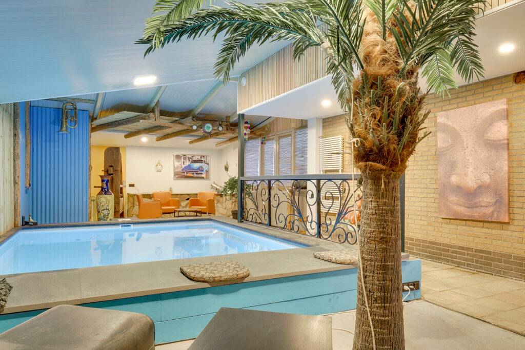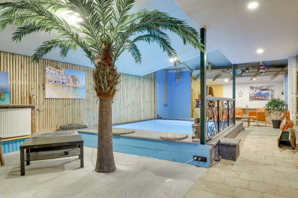 Begane Grond; Entree, hal met draaitrap, meterkast, inbouwkast en een afgesloten berging met wasmachine-aansluiting. Vanuit de hal is er toegang tot de slaapkamer en de doorzon woonkamer met een sfeervolle houtkachel en toegang tot het overkapte terras. De woonkamer is gesitueerd in een L-vorm en heeft een open doorgang naar de keuken. Deze keuken biedt tevens toegang tot het terras en beschikt over o.a. een kook/spoel-eiland en is voorzien van diverse inbouwapparatuur. Vanuit het terras is er middels twee openslaande deuren toegang tot de ruimte met het binnenzwembad. Het zwembad heeft nog een directe toegang aan de voorzijde en een derde toegang aan de achterzijde. Hier ligt een tweede keuken welke voorzien is van apparatuur. Een separaat toilet met fontein en een afgesloten berging zijn ook gelegen aan de achterzijde. Aan de voorzijde, naast de directe toegang tot het zwembad is een afgesloten berging aanwezig.