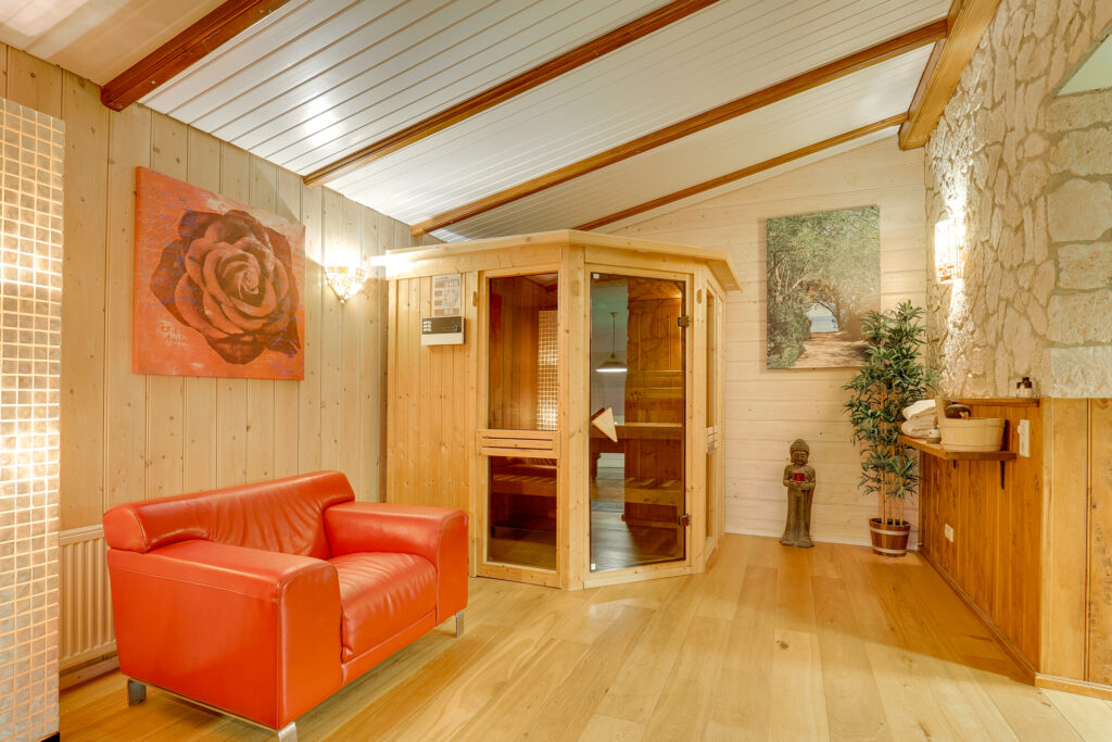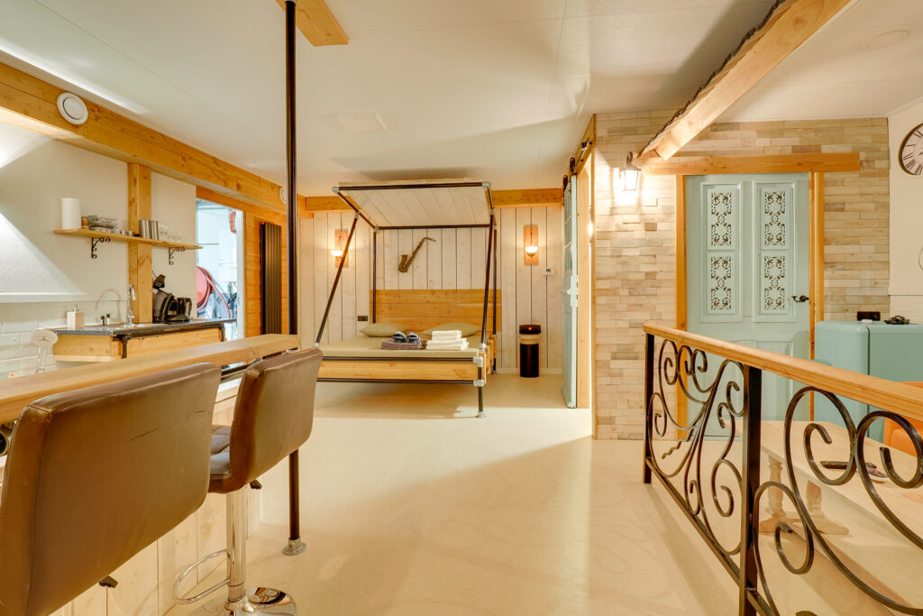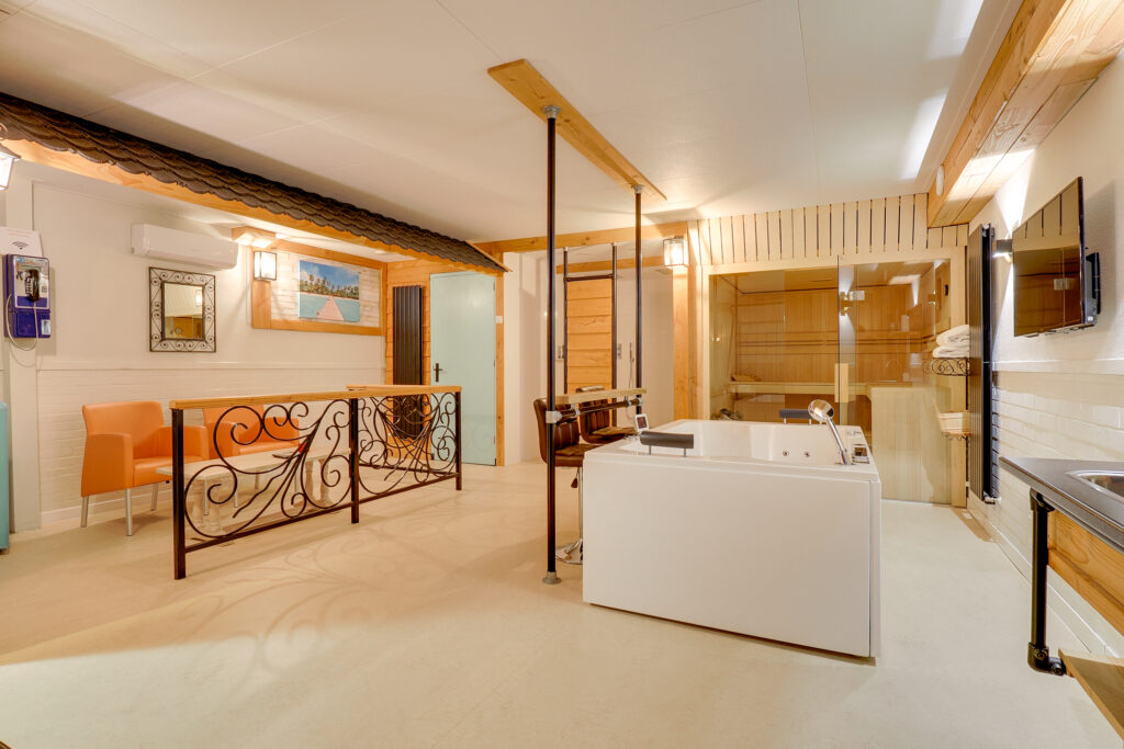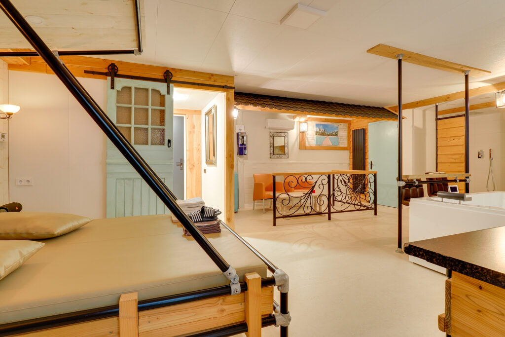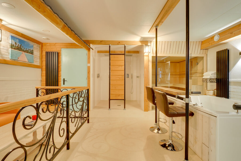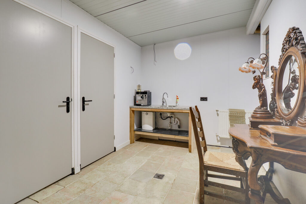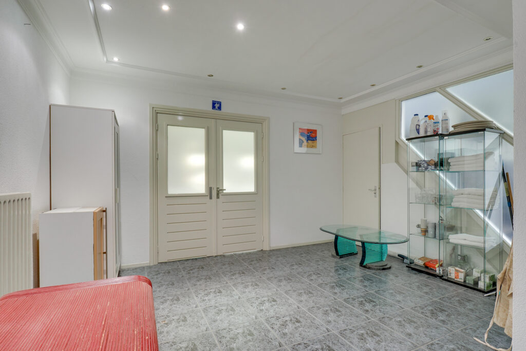 Een eerste entree komt uit in een voorportaal met een trapopgang en biedt toegang tot een royale hal. Deze hal beschikt over een trapkast en openslaande deuren naar een kamer. Deze kamer heeft een open toegang tot de zitkamer welke is voorzien van een jacuzzi, een sauna en een barok klassiek houten bargelegenheid. De zitkamer heeft een open doorgang naar een gang met een badkamer welke beschikt over een toilet, douche en wastafelmeubel. De gang heeft een kleine buitendeur die te bereiken is buitenom via een pad. Voor aan dit pad is er een entree met hal en een meterkast. Deze hal heeft ramen met uitkijk op de tweede zitkamer. Een vierder entree komt direct uit in de ruime wasruimte welke voorzien is van een c.v. installatie en een wasmachine-aansluiting. Vanuit de wasruimte is er een open toegang tot de tweede zitkamer welke voorzien is van een ligbad. De tweede zitkamer beschikt over een af te sluiten toiletruimte met een toilet en een wastafelmeubel. Daarnaast is de ruime inloopdouche gesitueerd en daarnaast staat een sauna. Vanuit de wasruimte is er toegang tot de royale berging welke is gesitueerd in het midden van het pand.