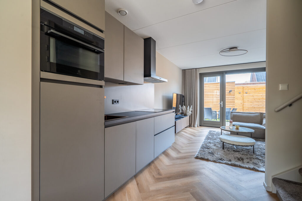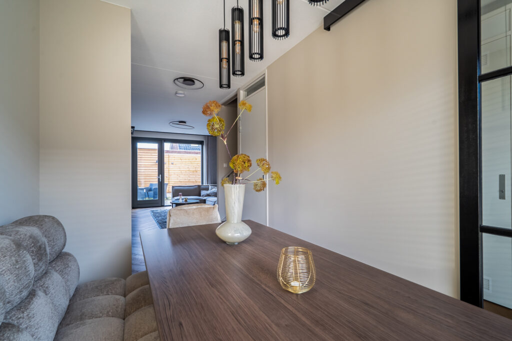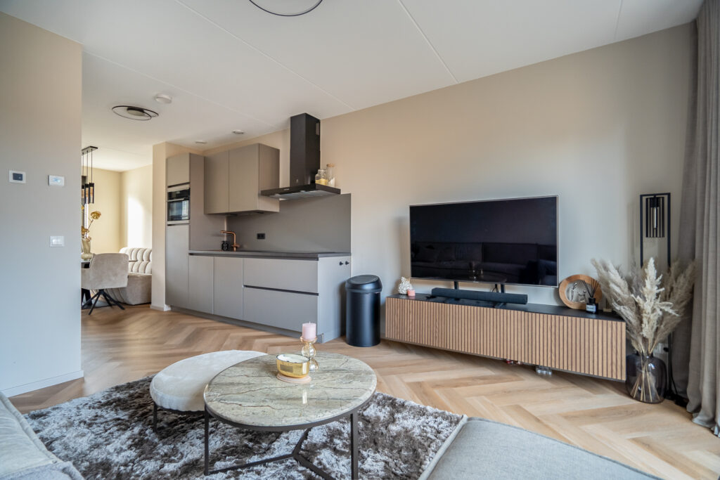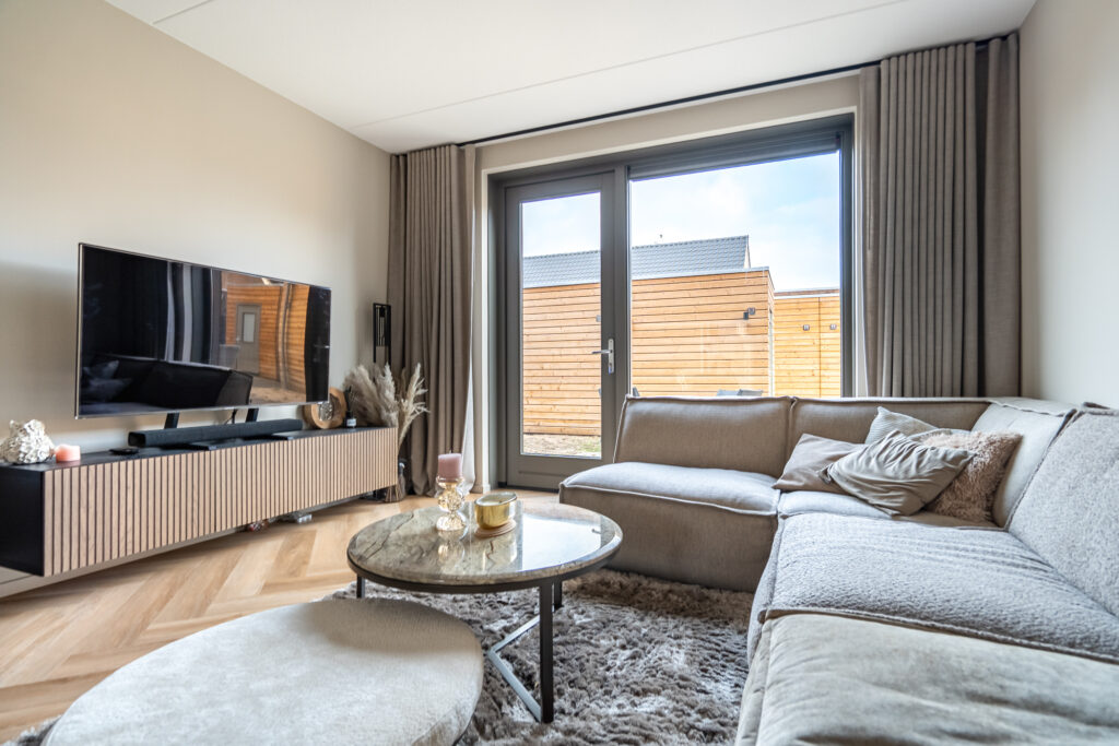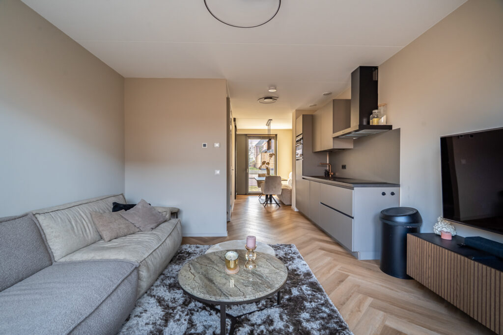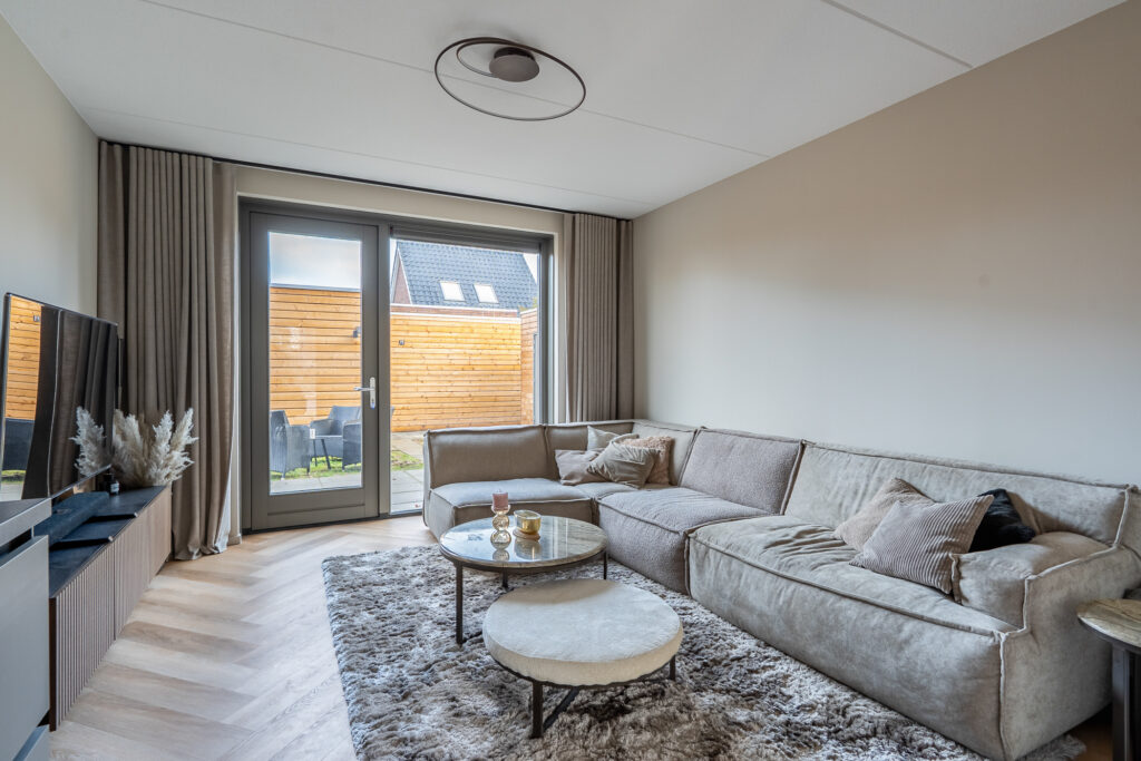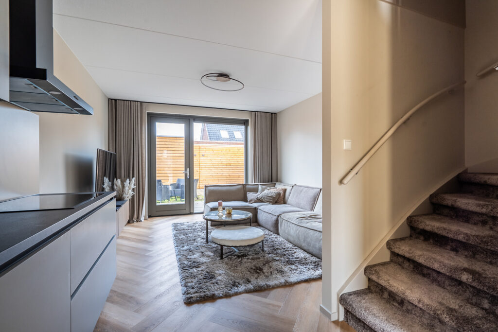 De woonkamer is gesitueerd aan de achterzijde van de woning en kenmerkt zich door de grote raampartij die doorloopt tot aan de vloer, wat zorgt voor veel lichtinval. Vanuit de woonkamer is er via een glazen buitendeur direct toegang tot het terras.