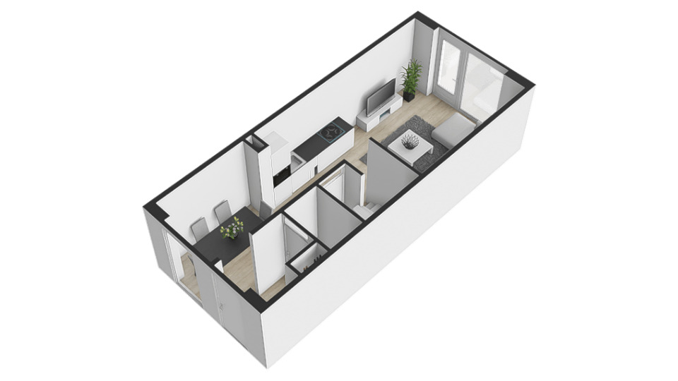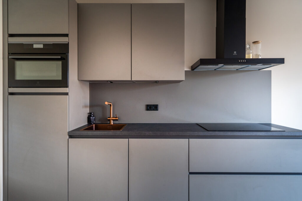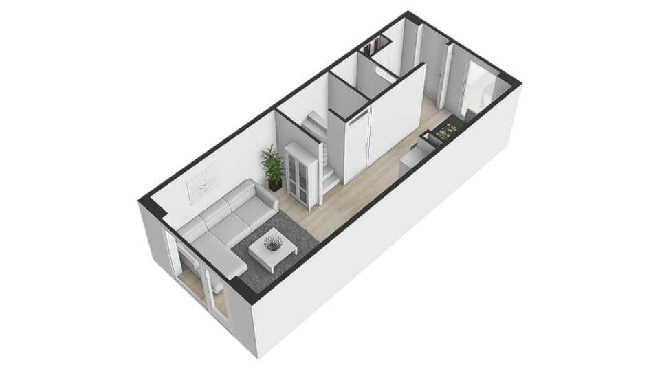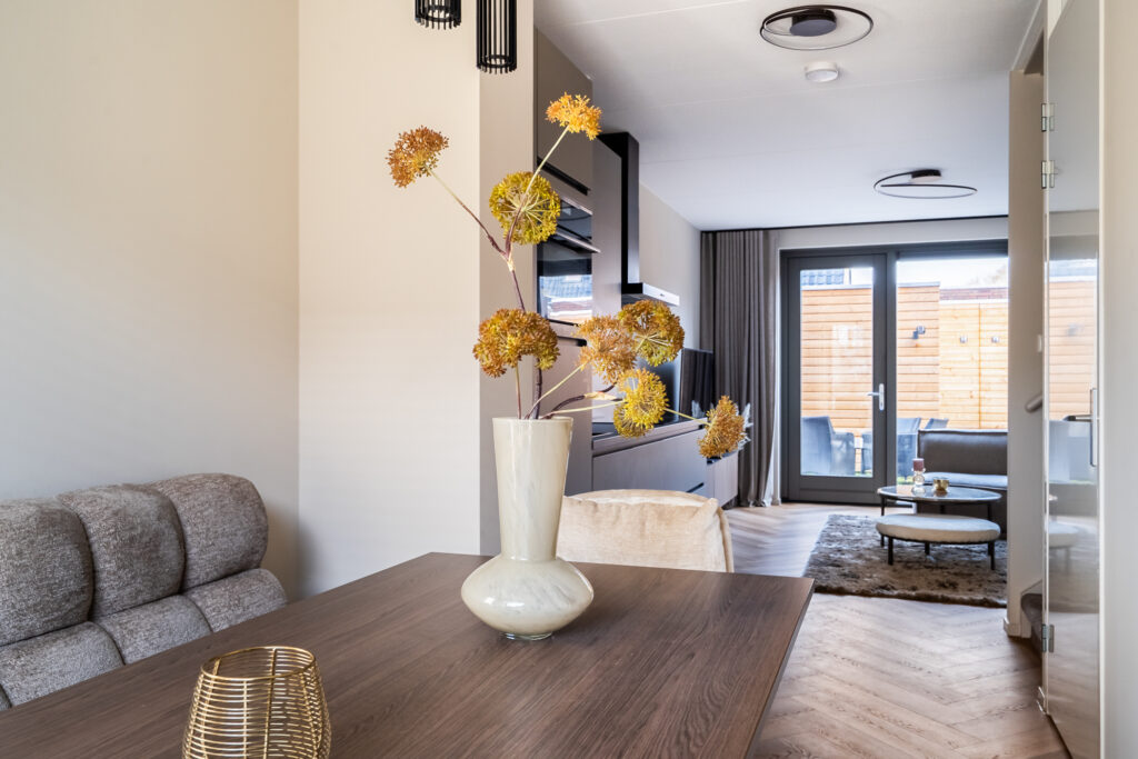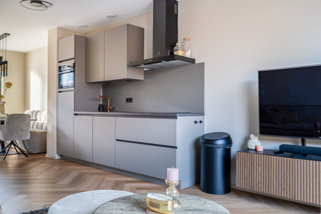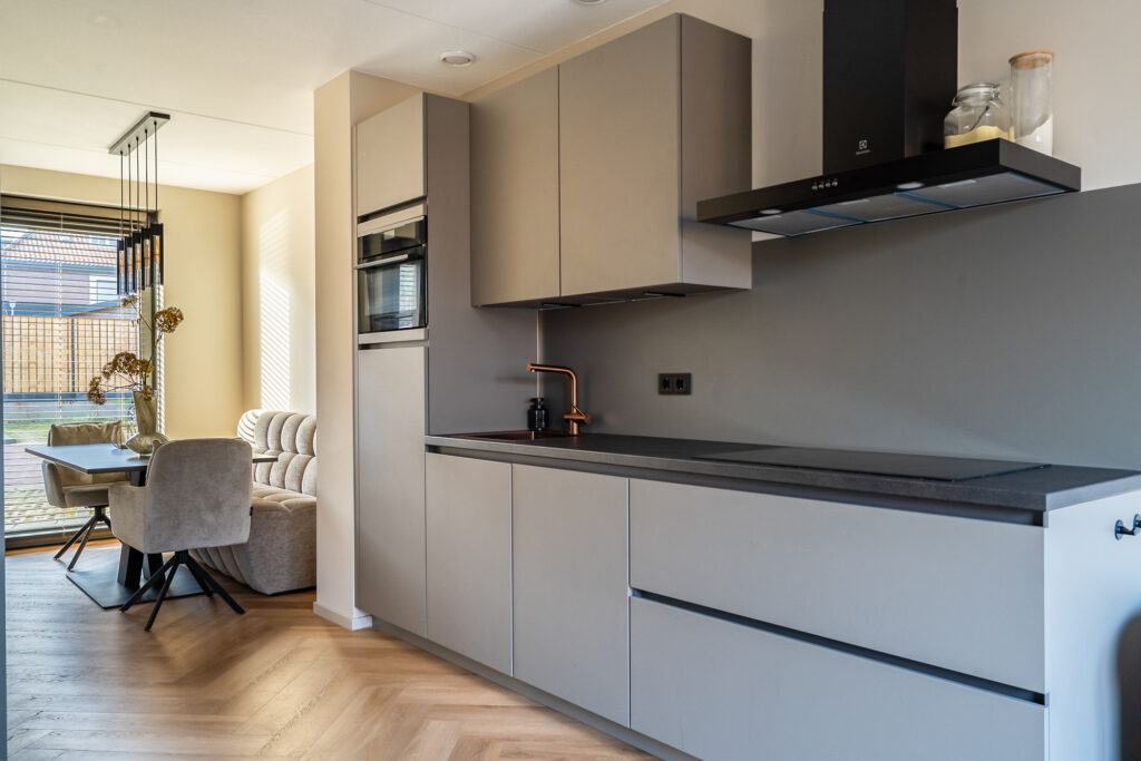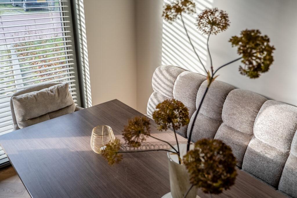 De woonkamer is gesitueerd aan de achterzijde van de woning en kenmerkt zich door de grote raampartij die doorloopt tot aan de vloer, wat zorgt voor veel lichtinval. Vanuit de woonkamer is er via een glazen buitendeur direct toegang tot het terras.