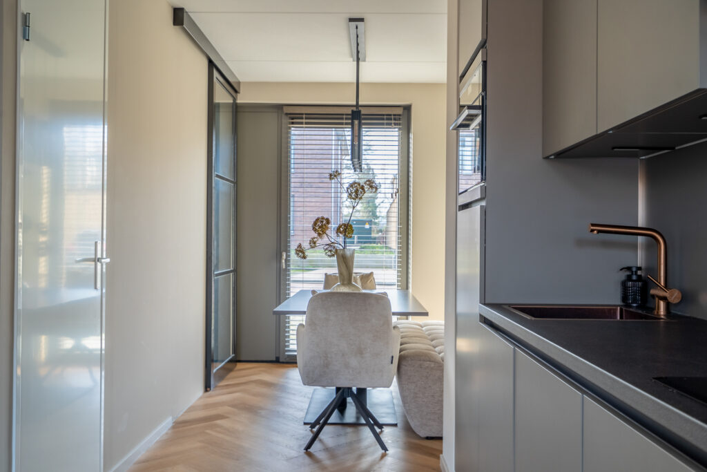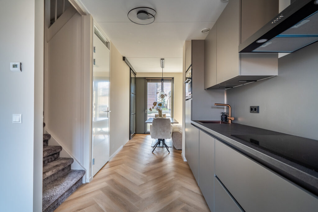 Begane Grond; Via het trottoir bereikt u de entree van de woning. De hal is voorzien van een inbouwmeterkast en een separaat toilet. Vanuit de hal heeft u toegang tot de eethoek middels een hippe stalen glazen pui, die in open verbinding staat met de centraal gelegen keuken. De keuken is modern uitgevoerd en voorzien van diverse inbouwapparatuur. Tegenover de keuken bevindt zich een praktische trapkast.
