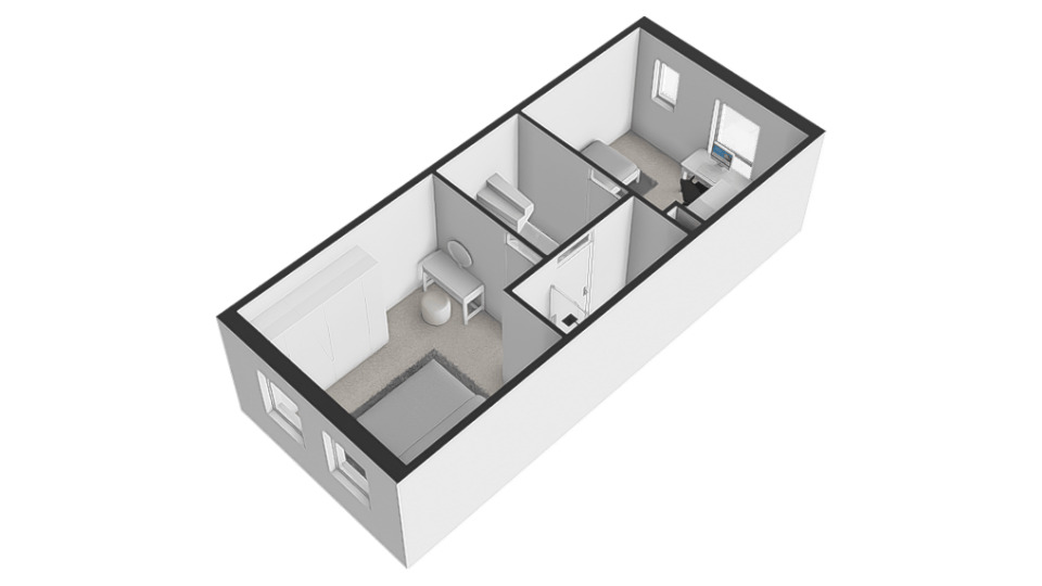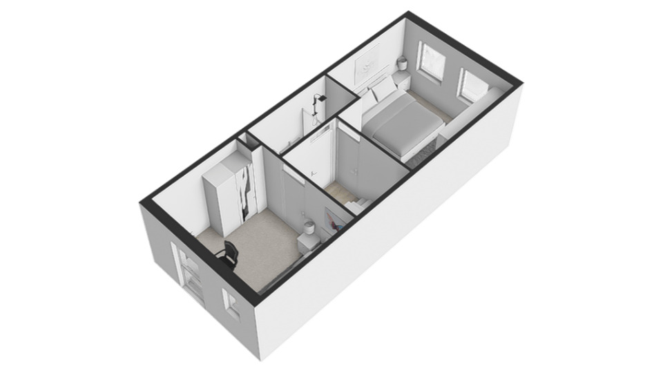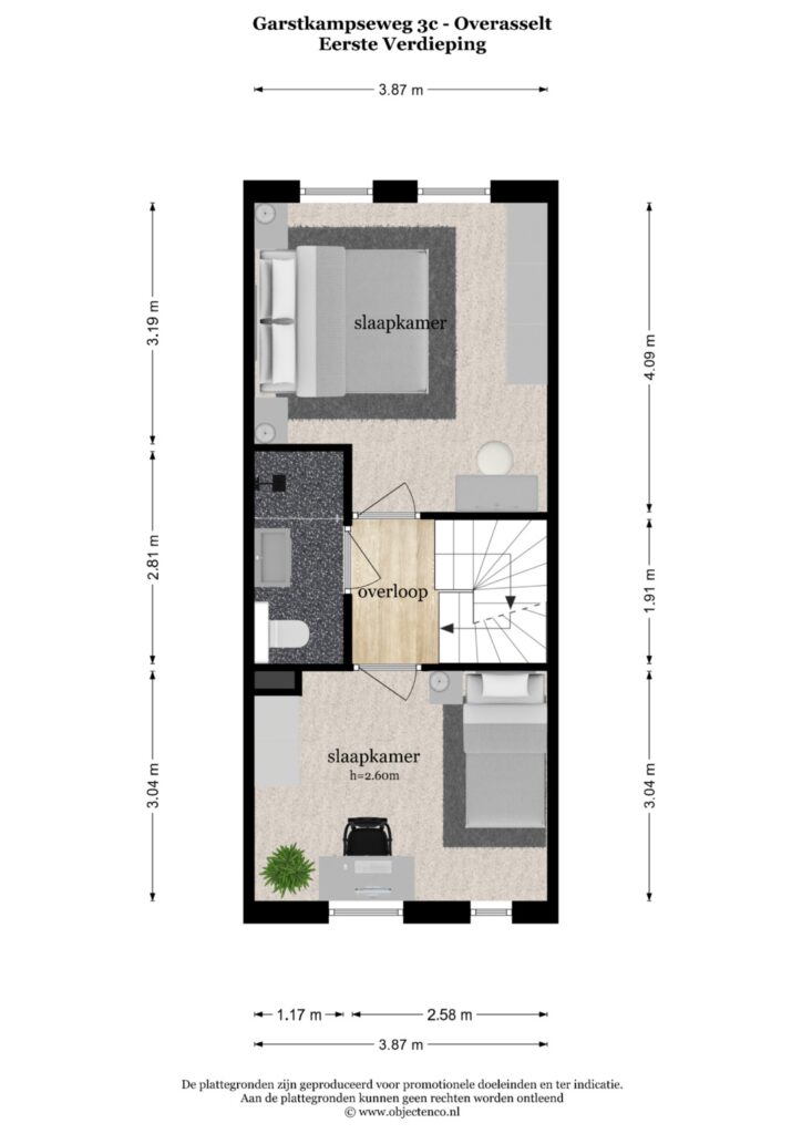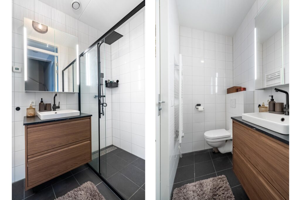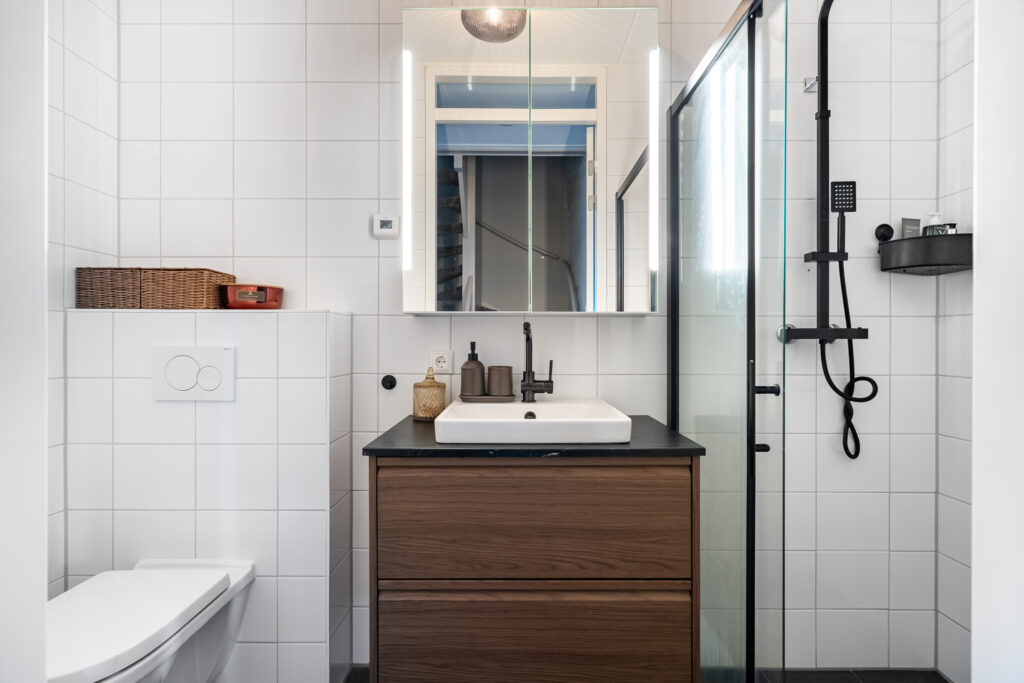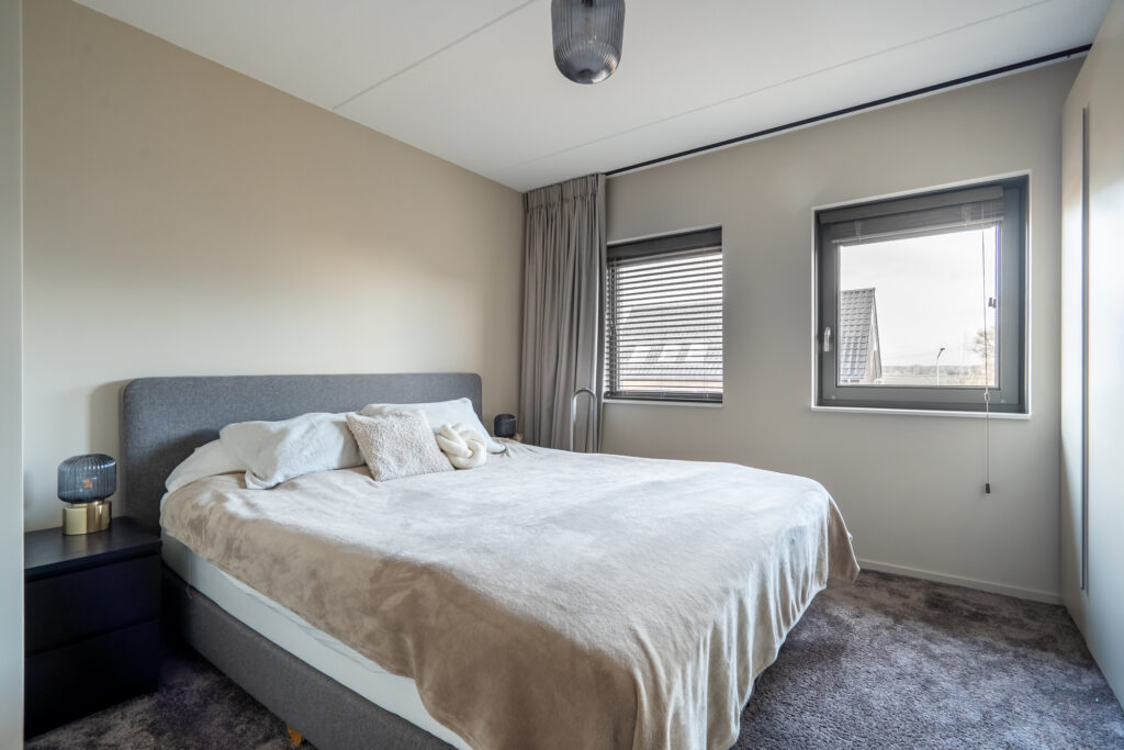 Overloop met toegang tot alle vertrekken, waaronder aan weerzijden twee slaapkamers en een badkamer. De badkamer beschikt over een tweede toilet, een wastafelmeubel en een inloopdouche.