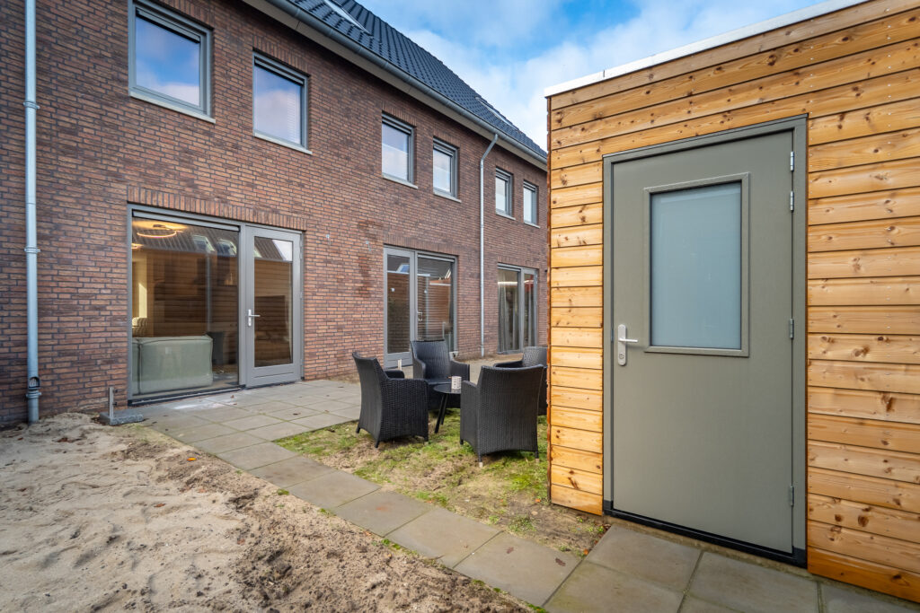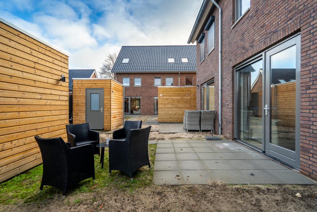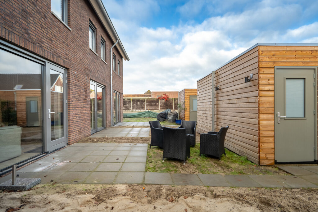 De achtertuin, het terras en het erf zijn momenteel open ingedeeld in samenhang met het nieuwgebouwde huizenblok en volledig voorzien van bestrating. Achter op het erf bevindt zich een eigen, afgesloten berging met voldoende ruimte voor fietsen en extra opslag.