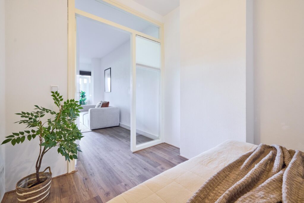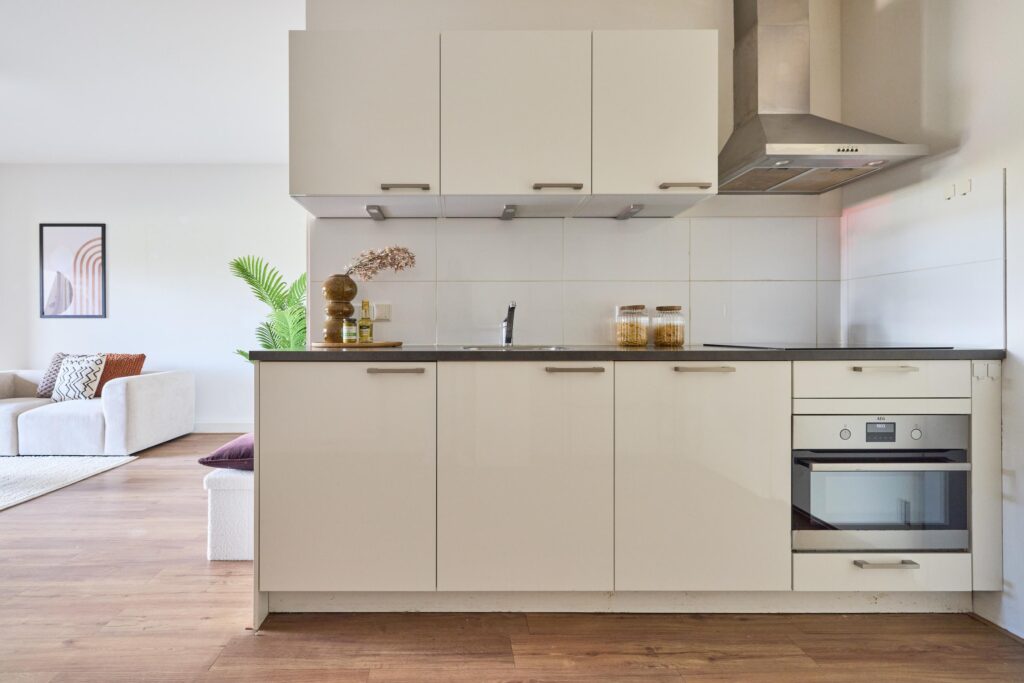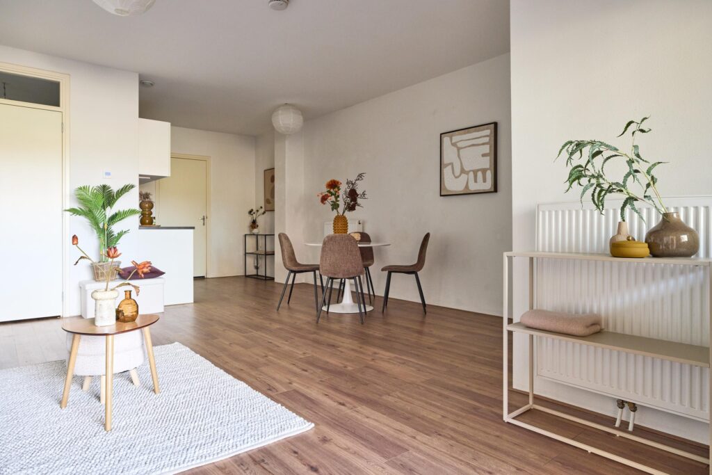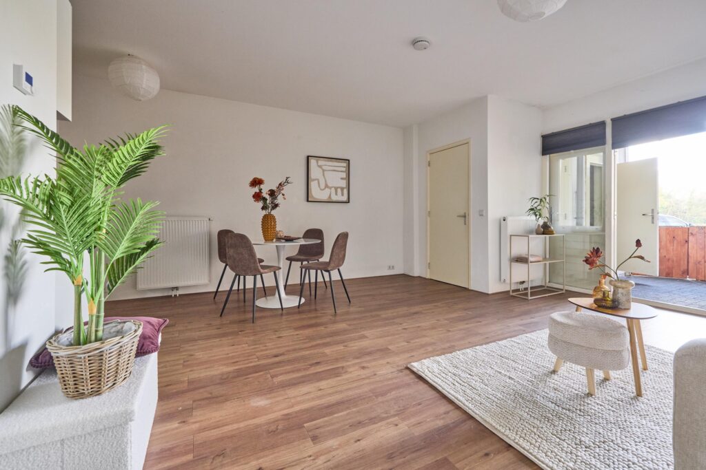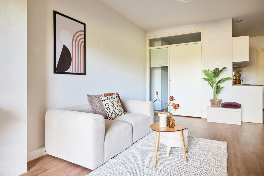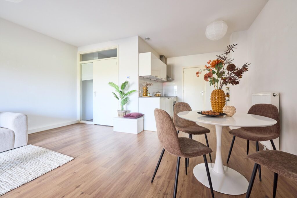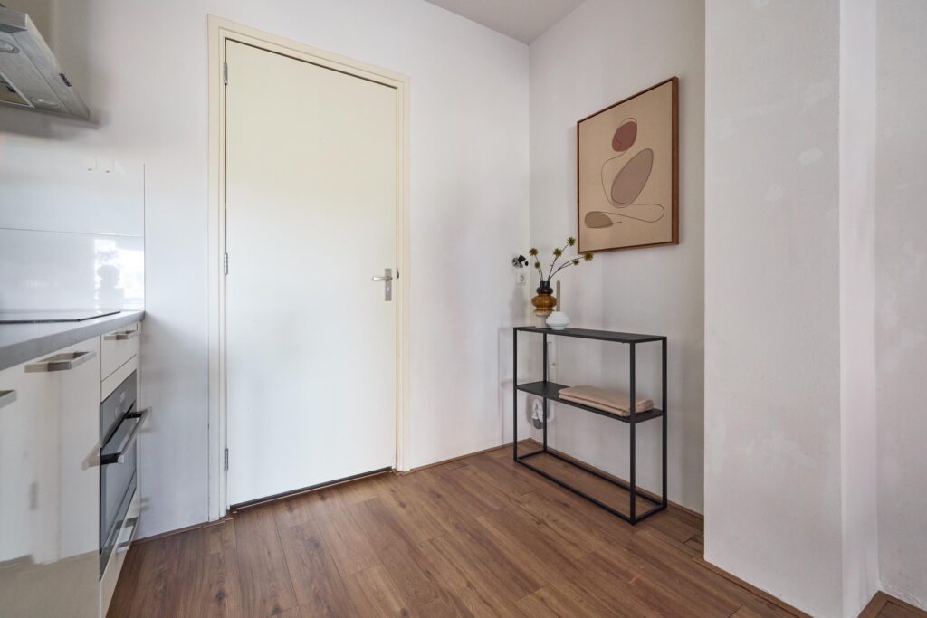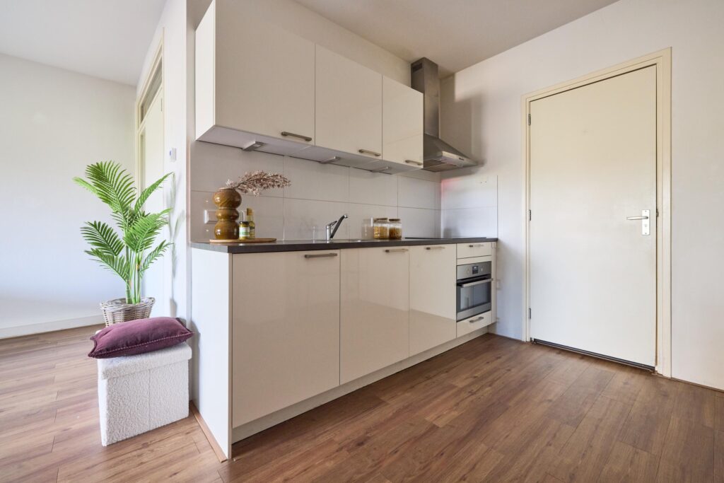 Via de entree komt u binnen in de hal, welke toegang biedt tot de verschillende vertrekken van de woning. De woonkamer is licht en ruim genoeg voor een comfortabele zithoek en eethoek en vormt het centrale punt van het appartement. De keuken is eenvoudig uitgevoerd en praktisch ingericht, met de nodige basisvoorzieningen voor dagelijks gebruik.