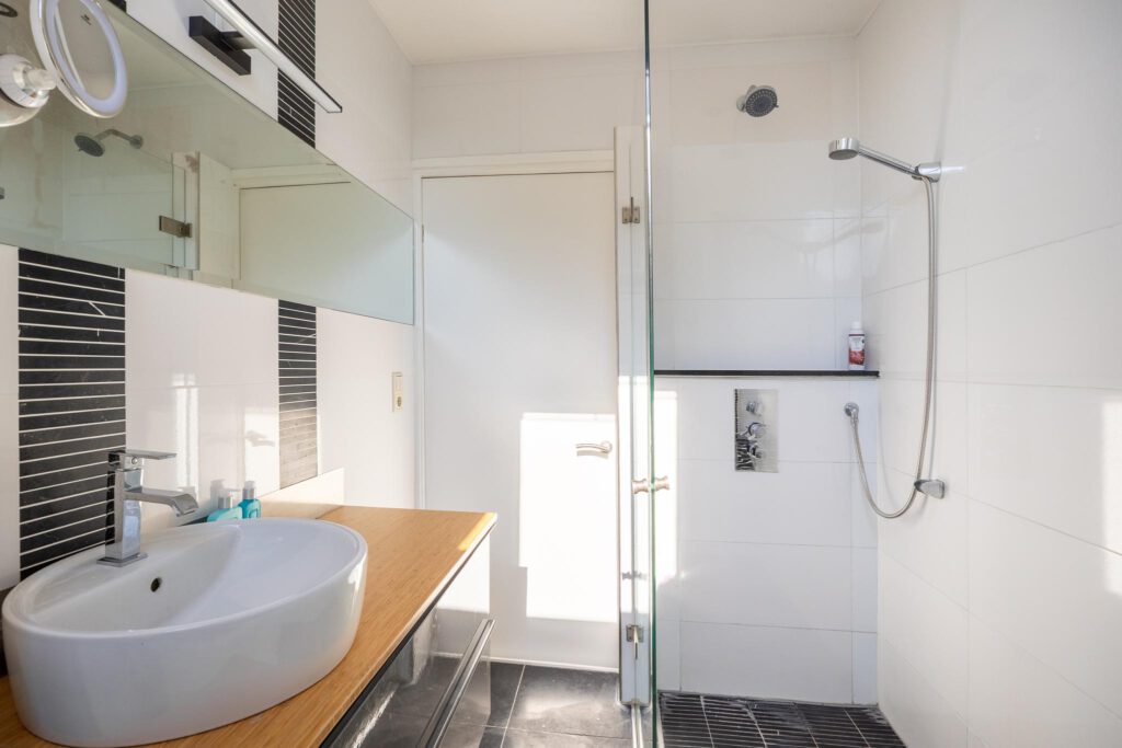 Twee ruime slaapkamers, elk met ingebouwde kastruimte voorzien van stijlvolle paneeldeuren. De nette badkamer beschikt over een hoek bad, aparte douche en een modern wastafelmeubel. Daarnaast is er op de overloop een tweede toilet met fonteintje.