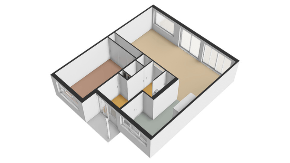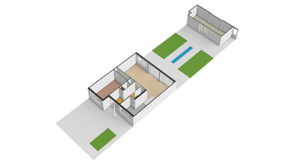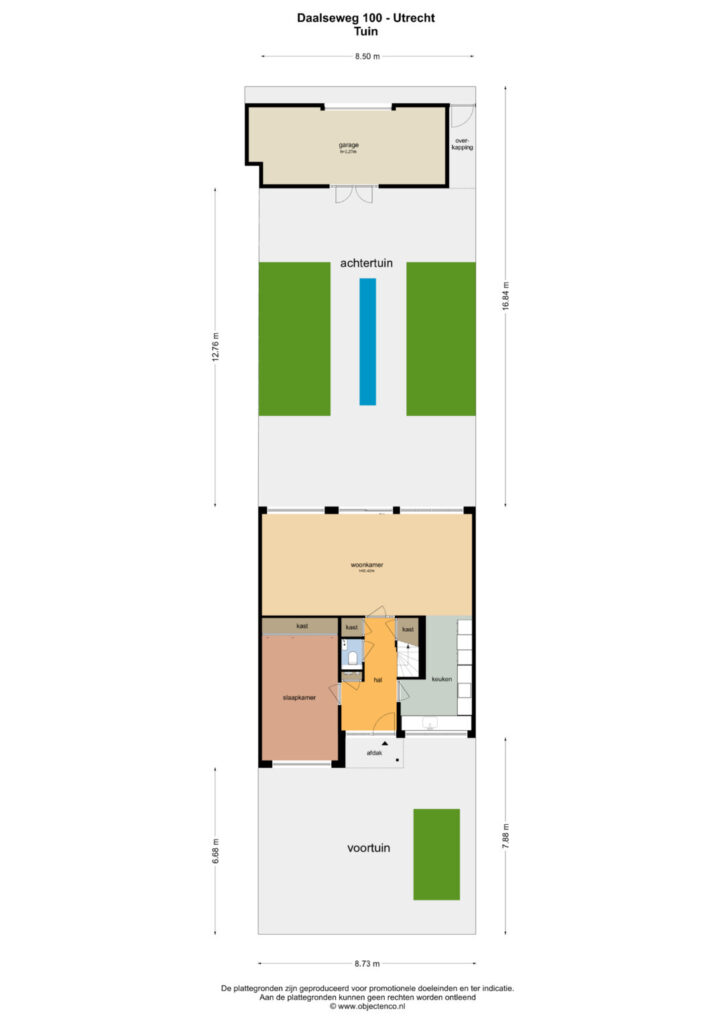Begane Grond; Voortuin met oprit/parkeermogelijkheid voor twee auto’s en een gazon. Voordeur met luifel, entree, hal met meterkast en trapopgang met trapkast. Toegang tot alle vertrekken, waaronder een separaat toilet met fontein, een inbouwkast en doorloop naar de doorzon woonkamer. De woonkamer is gelegen over de gehele breedte en heeft een schuifpui naar het terras en de aanwezige achtertuin. Weer terug naar de hal, is rechts een deur te vinden naar de keuken. De keuken is gesitueerd in een hoekopstelling en is voorzien van diverse inbouwapparatuur. Vanuit de keuken is er een open doorloop naar de living. Links van de hal ligt de deur naar de ruime slaapkamer, welke voorzien is van een kastenwand met schuifdeuren.