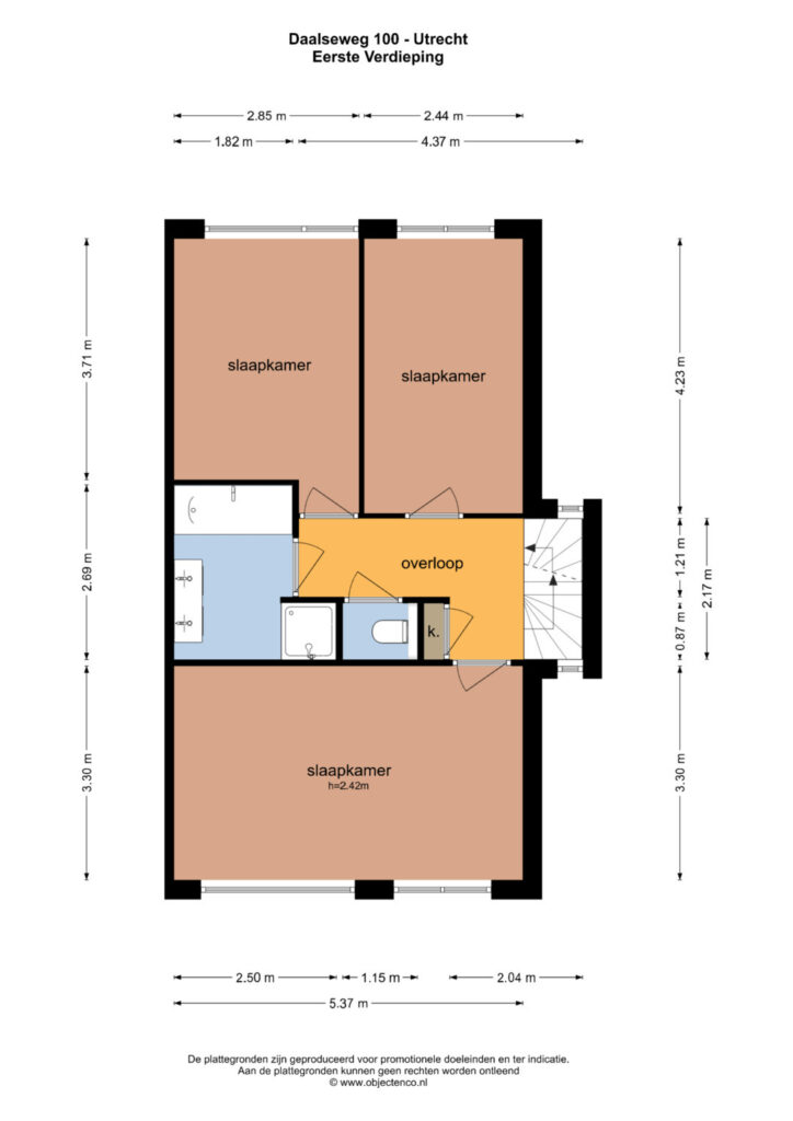 Eerste Verdieping; Overloop met trapopgang en een inbouwkast. Toegang tot alle vertrekken, waaronder drie slaapkamers en een badkamer. Deze badkamer is voorzien van een ligbad, een dubbele wastafelmeubel en een douche. Het tweede toilet is separaat.