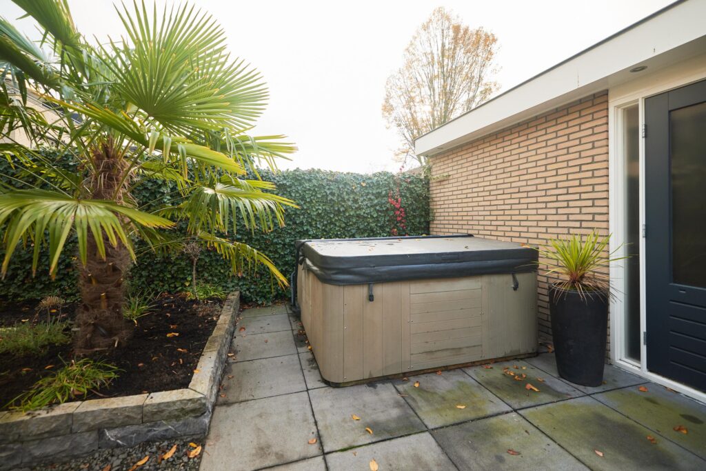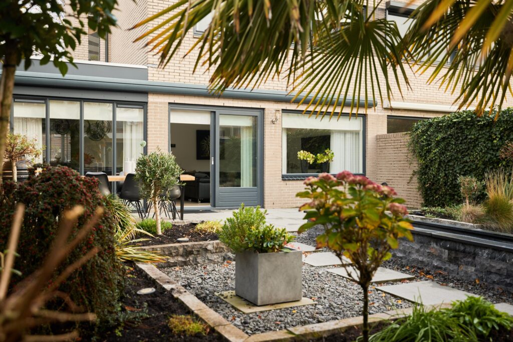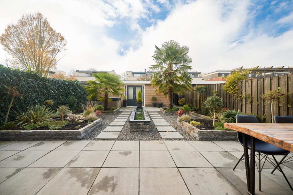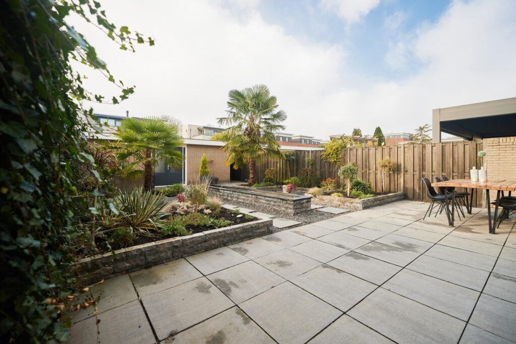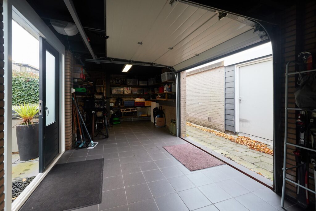 Tuin; De tuin is gelegen op het zuidwesten en heeft een achterom met overkapping bij de poort. De garage ligt over de breedte en beschikt over een brede elektrische overhead roldeur aan de buitenzijde. Openslaande deuren bieden toegang tot de achtertuin, welke is aangelegd met sierbestrating en gazon. In het midden is de prachtige moderne waterpartij gesitueerd.