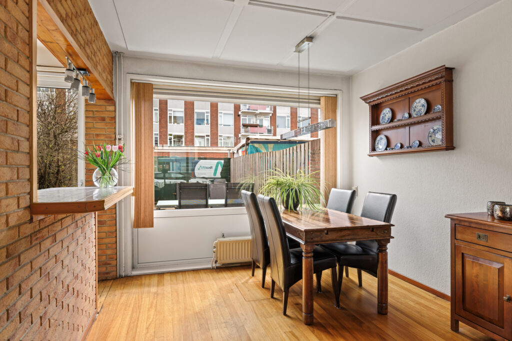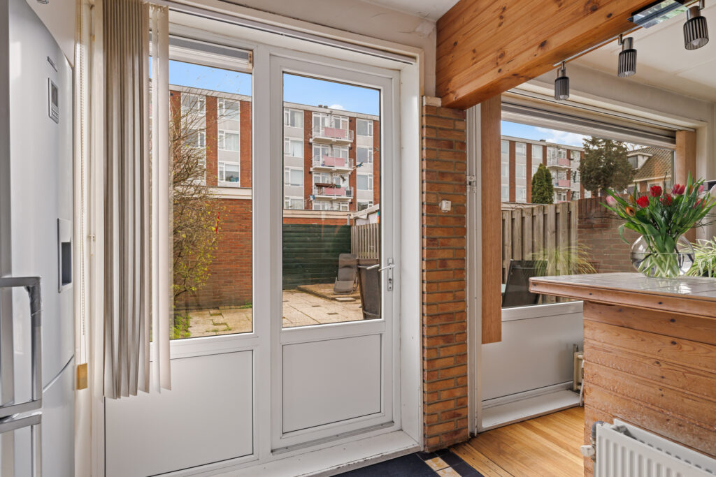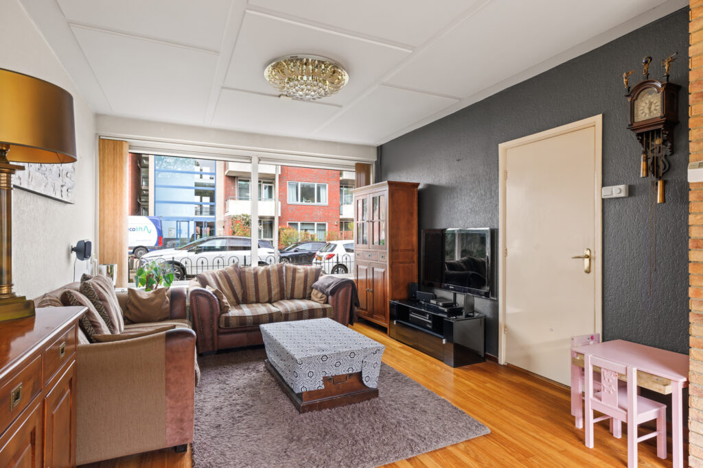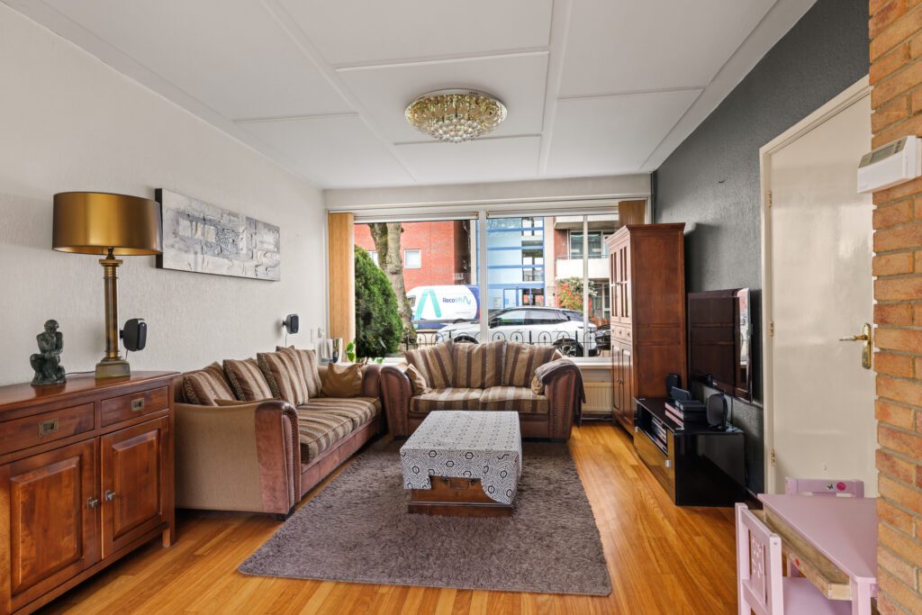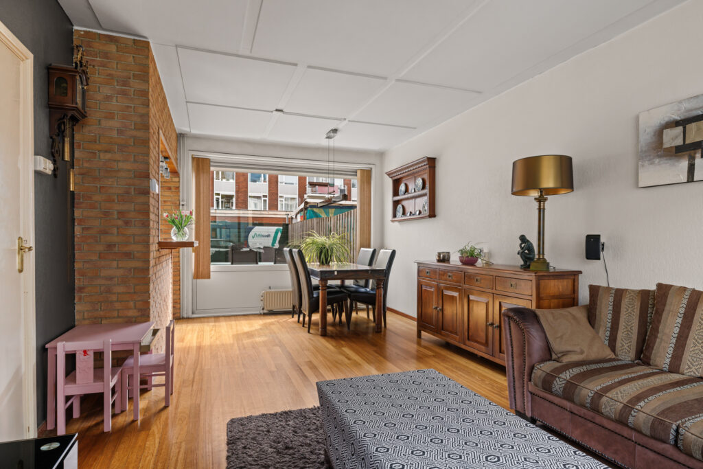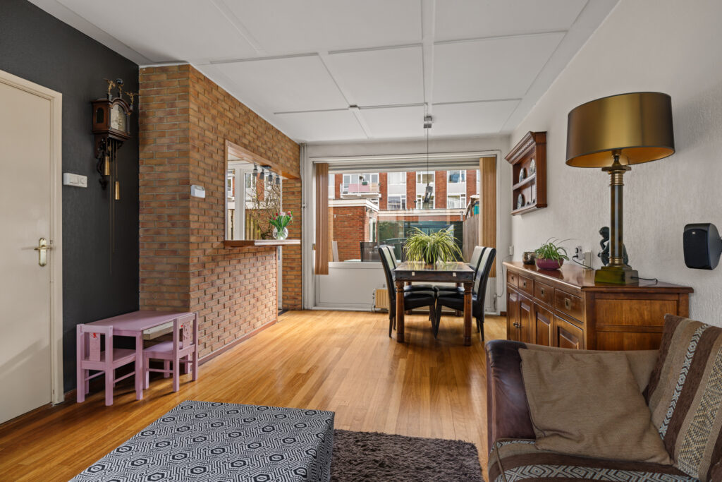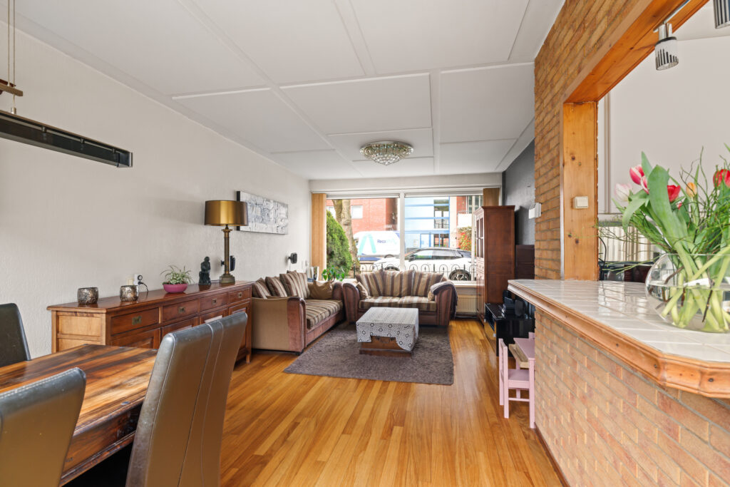 De woonkamer is ruim opgezet en profiteert van grote raampartijen, waardoor er veel daglicht binnenkomt. De aangrenzende keuken, met een barverbinding naar de living, bevindt zich aan de achterzijde en biedt direct toegang tot de tuin. De diepe achtertuin biedt volop ruimte om te genieten van het buitenleven, terwijl de voortuin zorgt voor een prettige afstand tot de straat. Daarnaast beschikt de woning over een externe berging, ideaal voor fietsen en extra opslag.