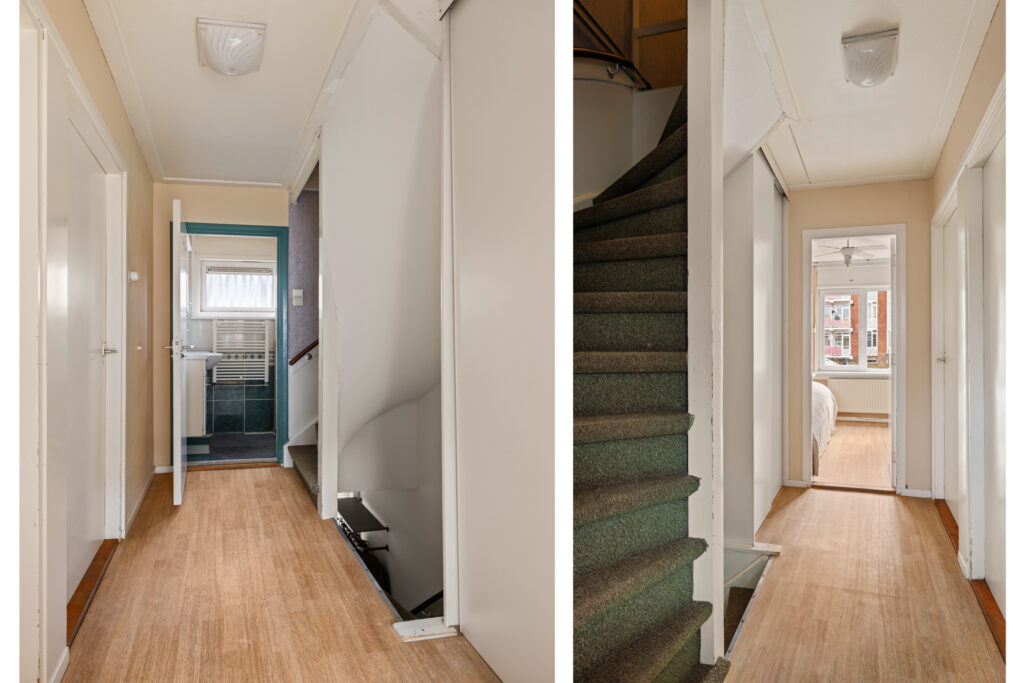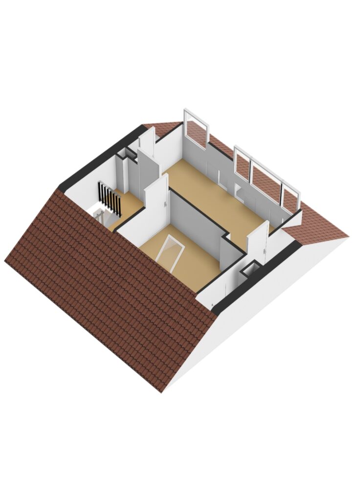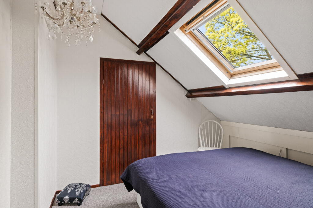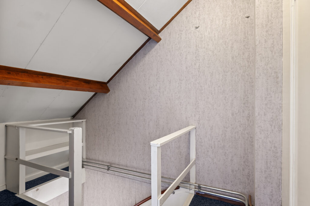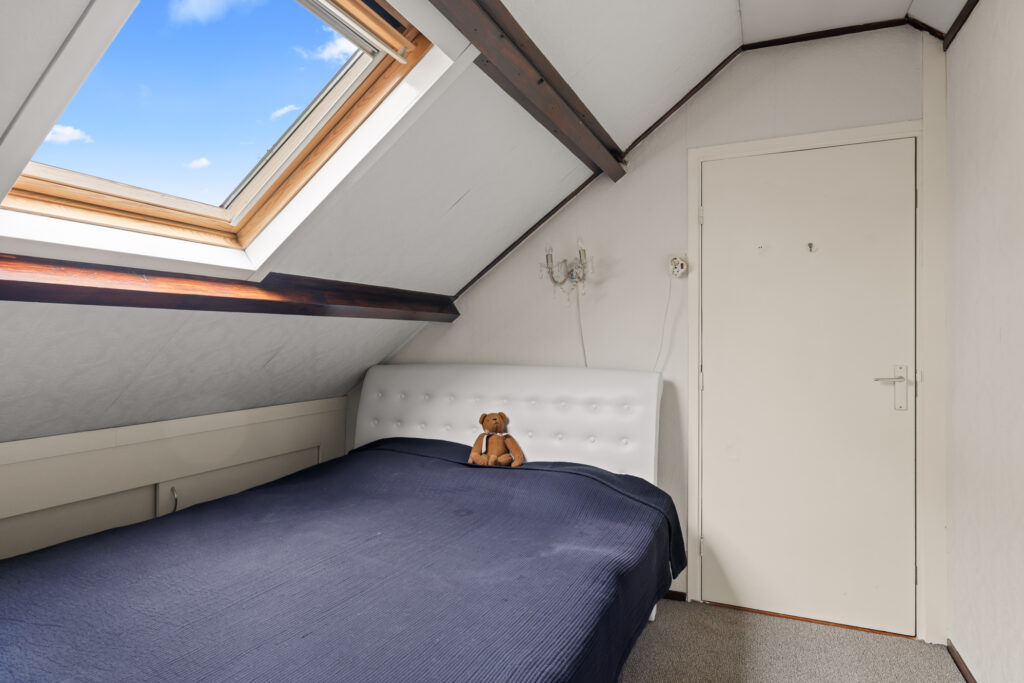 Tweede verdieping: Overloop met toegang tot extra slaapkamer(s). Deze verdieping biedt aanvullende ruimte die gebruikt kan worden als slaapkamer, werkruimte of hobbykamer en beschikt tevens over bergruimte onder de schuine kap.
