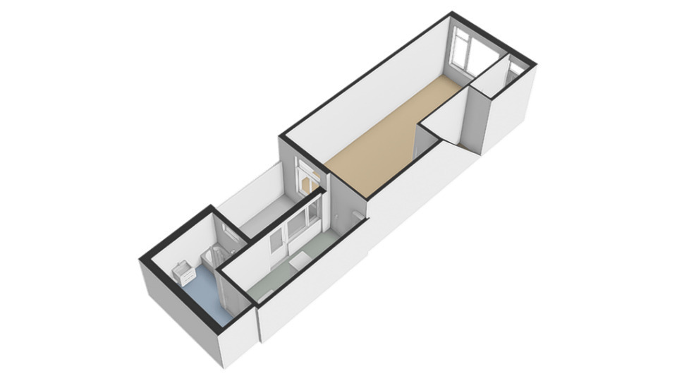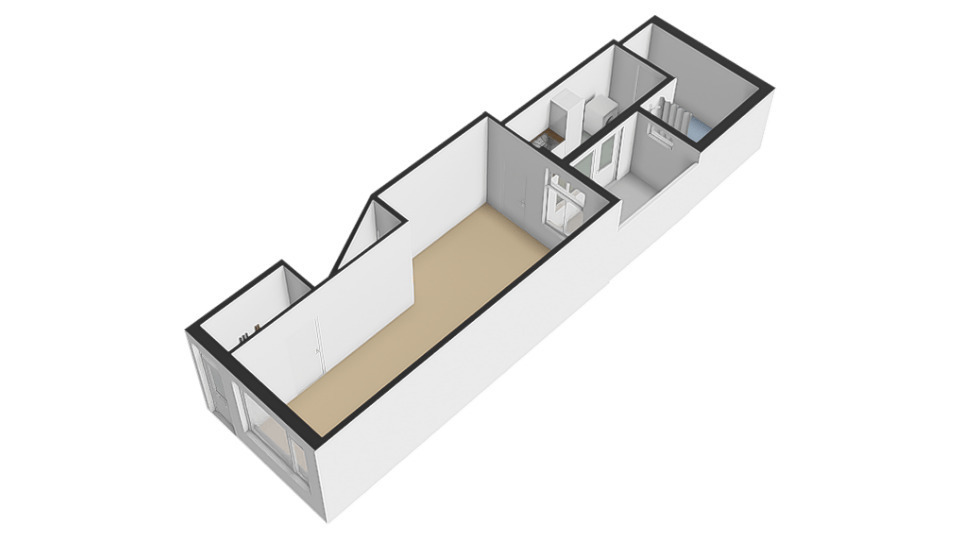 Begane Grond; Voordeur vanaf het trottoir, entree, hal met meterkast en toegang tot de doorzon woonkamer. De woonkamer beschikt over een berging onder de trap van de bovenste woning. Aan e achterzijde van de living is er een gesloten toegang tot de keuken welke beschikt over apparatuur en geheel langs de wand is gesitueerd. De keuken loopt in de lengte door naar de bijkeuken met een wasmachine-aansluiting. De keuken biedt toegang tot de patio, omringt met wanden en relatief veel privacy. Aan het einde van de bijkeuken is de deur naar de badkamer. De badkamer is gelegen over de gehele breedte van het perceel en beschikt over een combinatie douche/ligbad, een wastafel en een toilet.