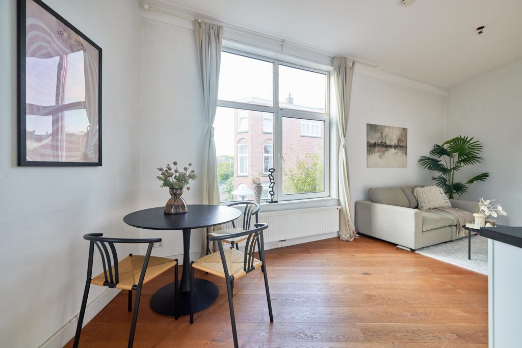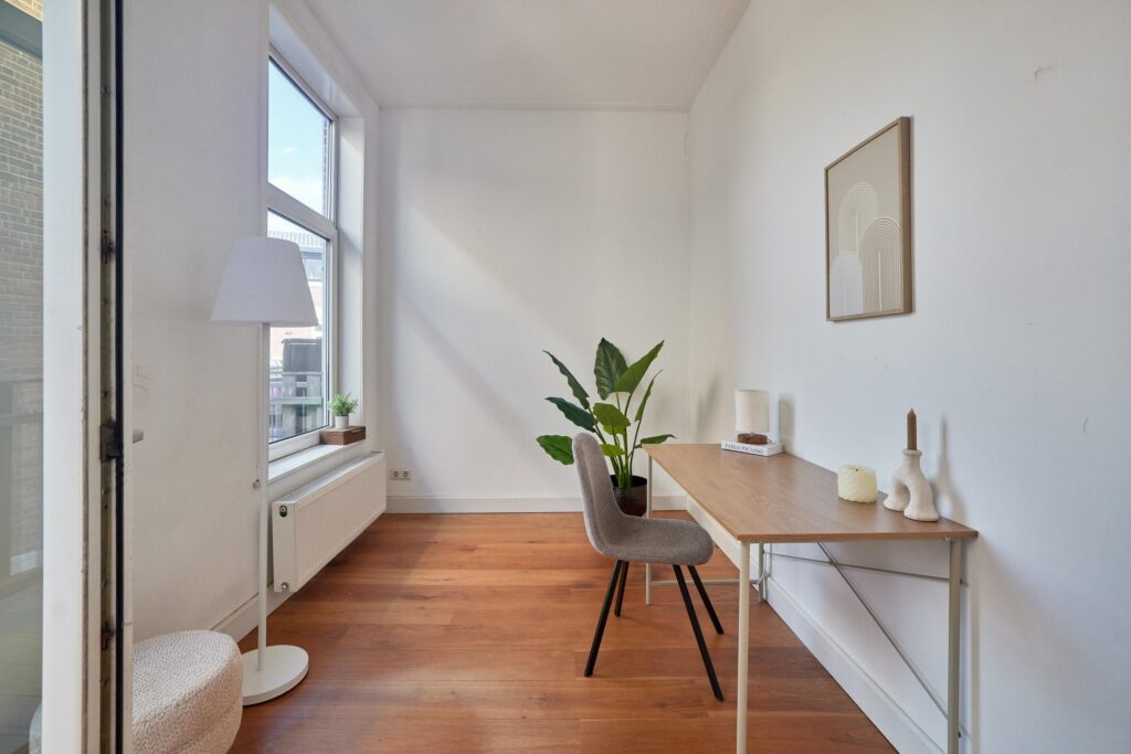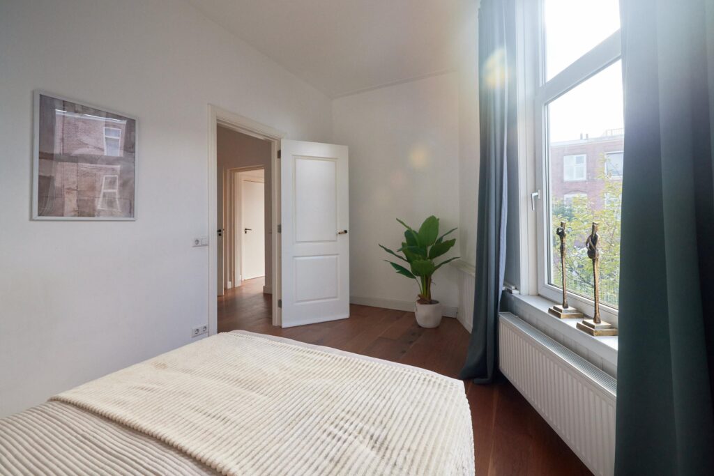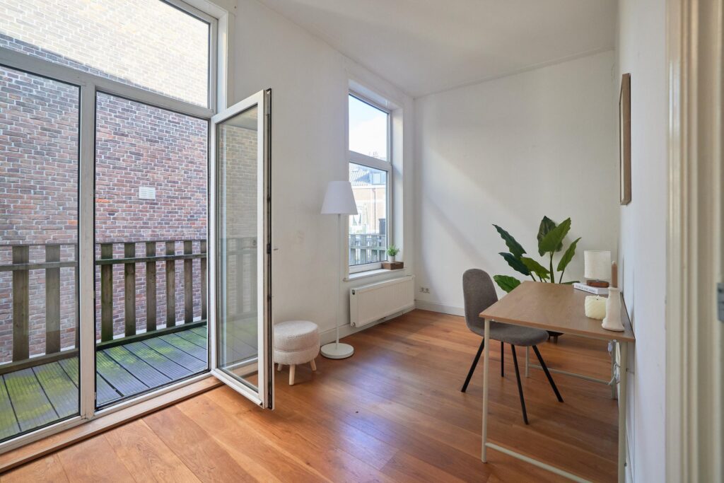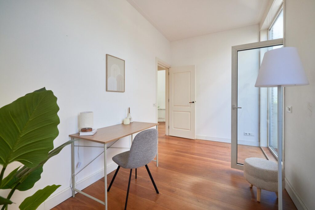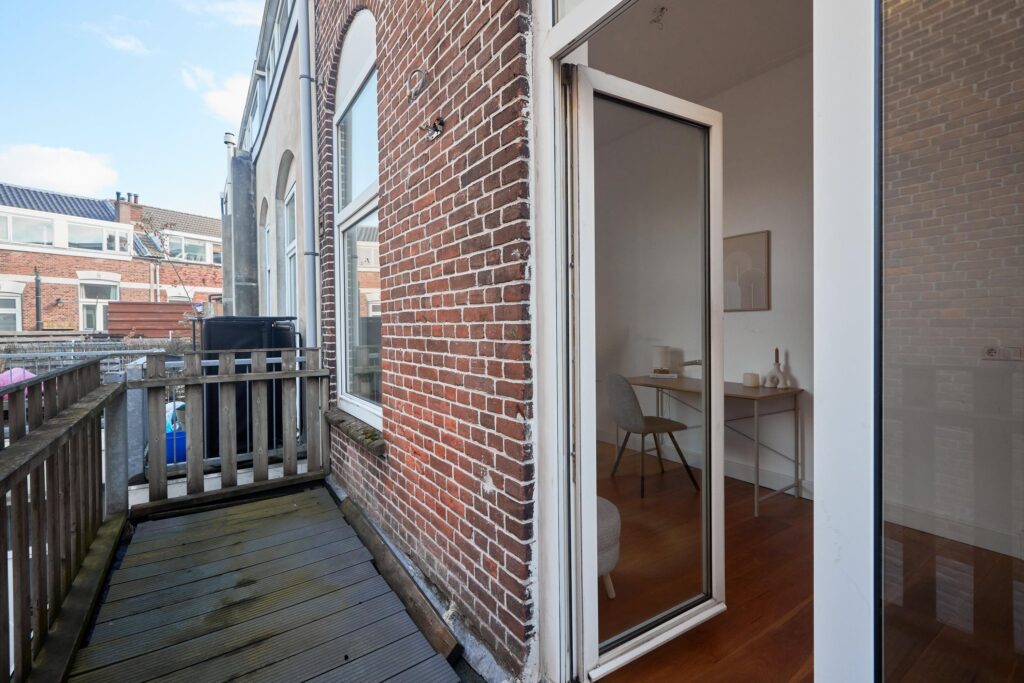 De fraaie houten vloer loopt door de hele woning en de moderne keuken is uitgerust met diverse inbouwapparatuur. Dankzij de hoekligging geniet je van veel natuurlijk daglicht. De tweede slaapkamer is ideaal als werk- of studeerkamer, waar je bovendien direct toegang hebt tot het balkon. Een heerlijke plek om te werken of ontspannen met uitzicht op de groene binnentuinen van de buurt.