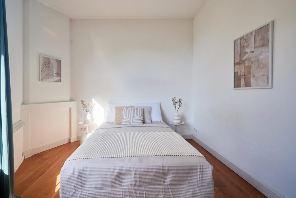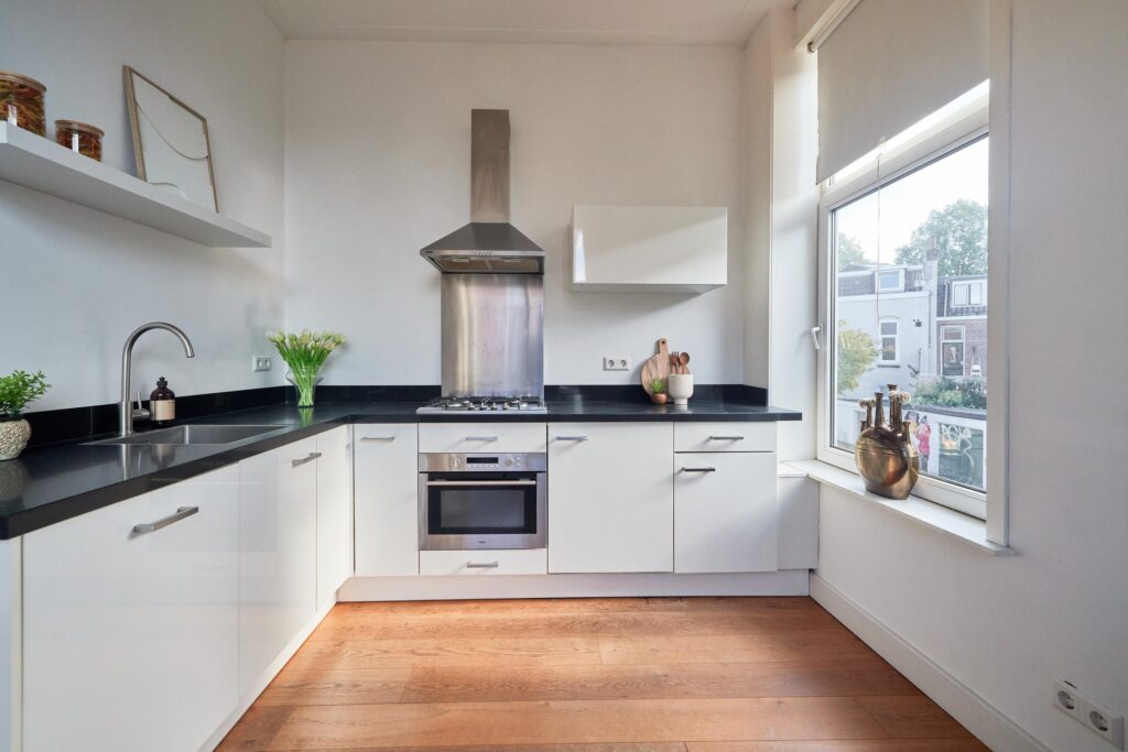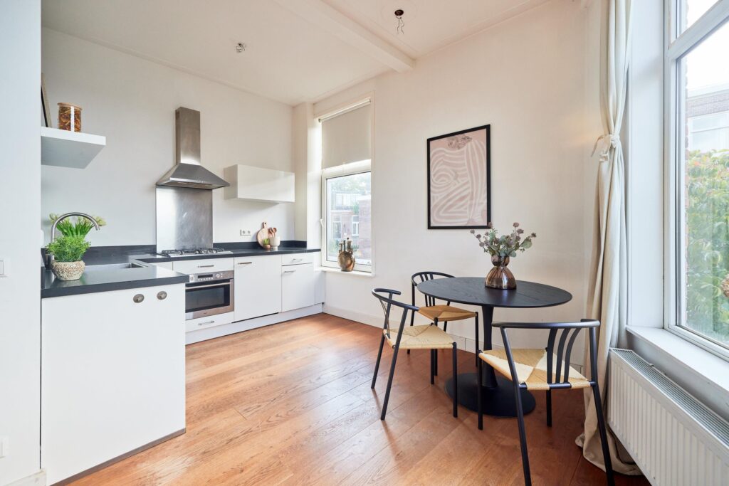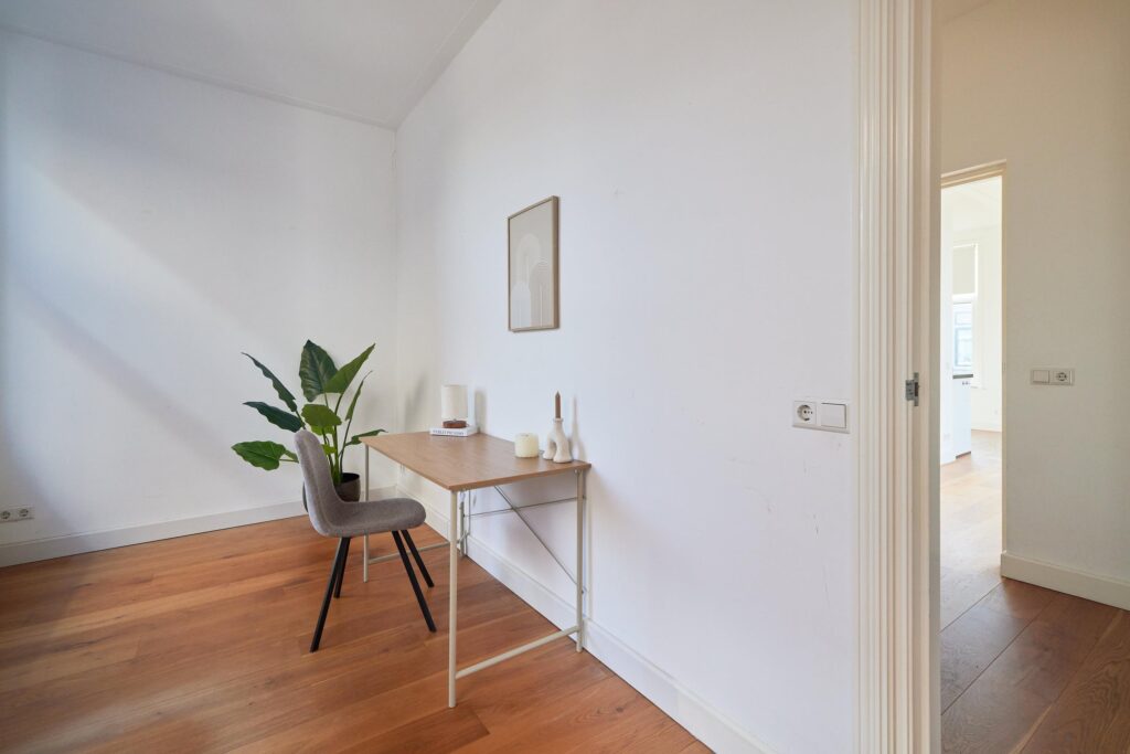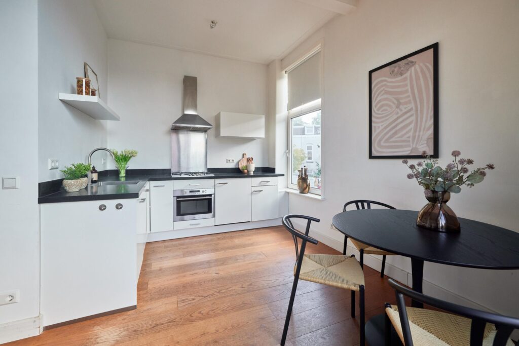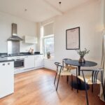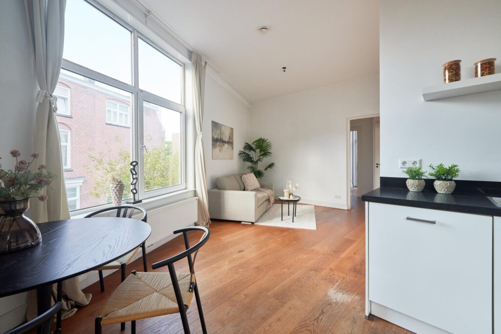 De fraaie houten vloer loopt door de hele woning en de moderne keuken is uitgerust met diverse inbouwapparatuur. Dankzij de hoekligging geniet je van veel natuurlijk daglicht. De tweede slaapkamer is ideaal als werk- of studeerkamer, waar je bovendien direct toegang hebt tot het balkon. Een heerlijke plek om te werken of ontspannen met uitzicht op de groene binnentuinen van de buurt.
