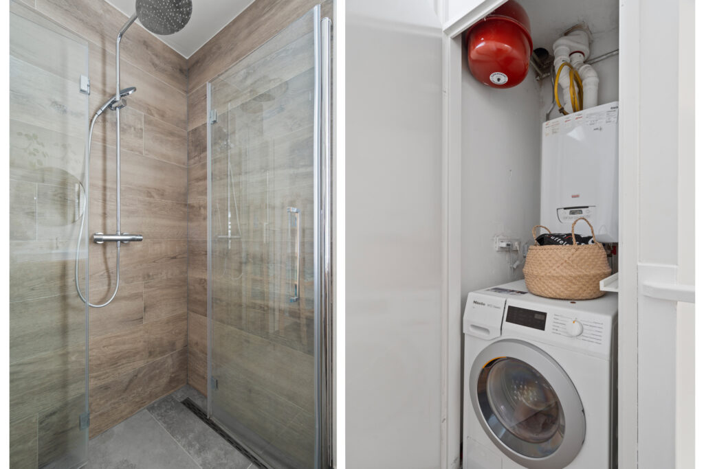 Eerste Verdieping; Overloop met een afgesloten ruimte voor de wasmachine en de c.v. opstelling en toegang tot alle vertrekken, waaronder drie slaapkamers en een badkamer. De badkamer is voorzien van betegeling, een tweede toilet, een wastafelmeubel, een douche en elektrische vloerverwarming.