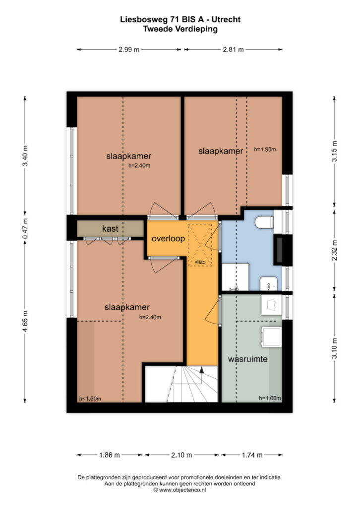 Tweede verdieping: Overloop met vlizotrap naar de zolder. Op deze verdieping bevinden zich drie slaapkamers, allen onder een sfeervol schuin dak. De masterbedroom beschikt over een praktische inbouwkast. De badkamer is voorzien van een tweede toilet, wastafelmeubel en douche. Naast de badkamer is een aparte wasruimte met aansluiting voor wasmachine en droger aanwezig.