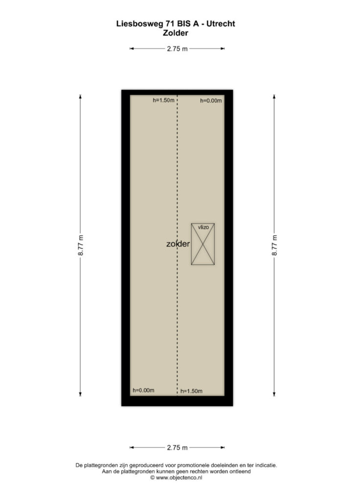 Zolder: Via de vlizotrap is de bovenste ruimte van het pand bereikbaar, met een hoogte van 1,5 meter in het midden.