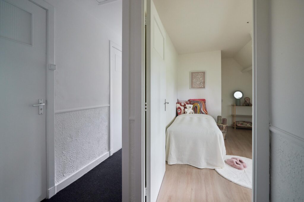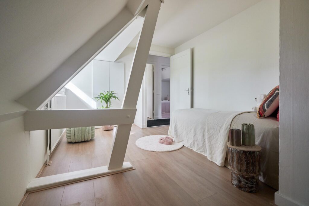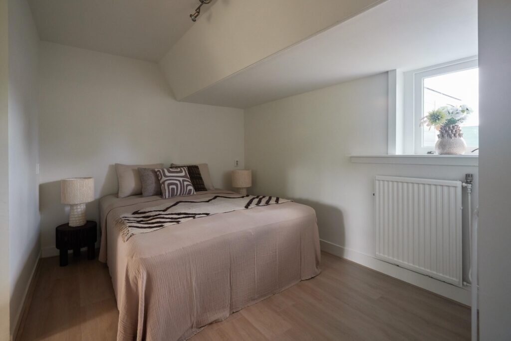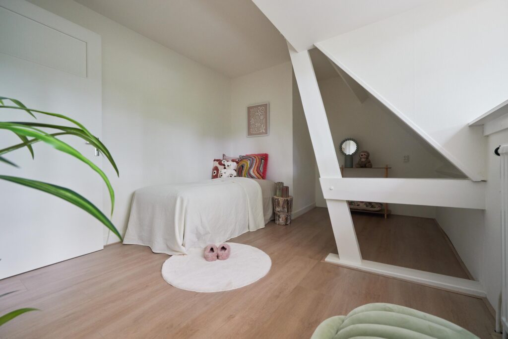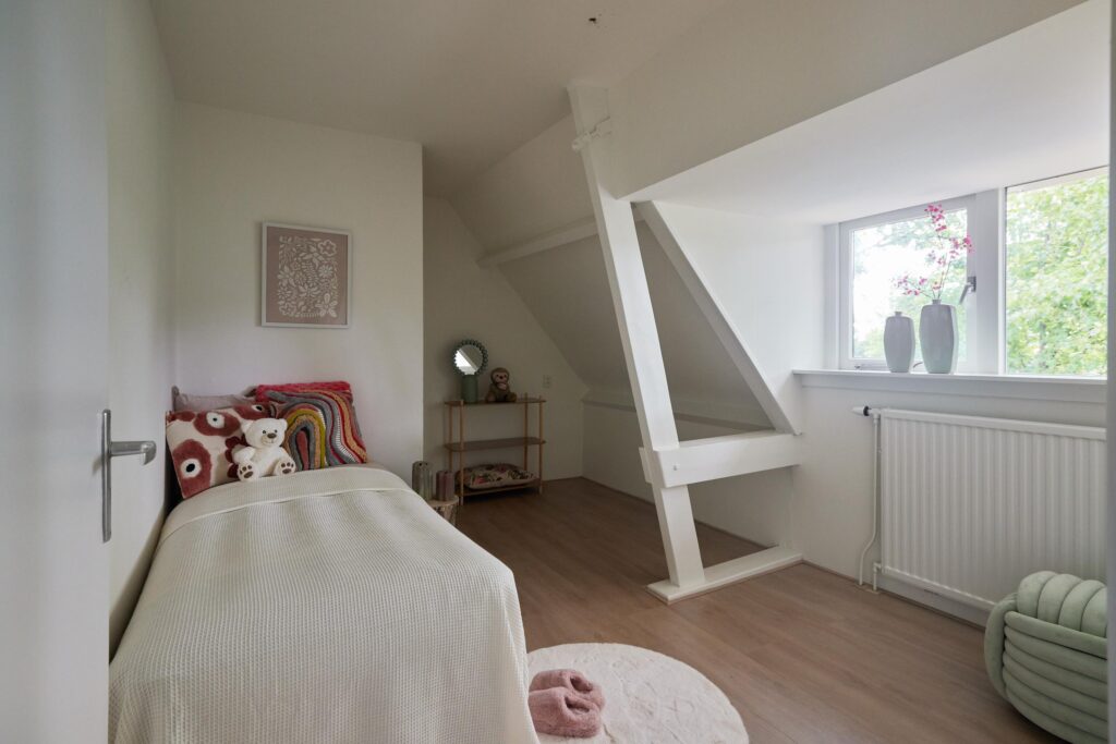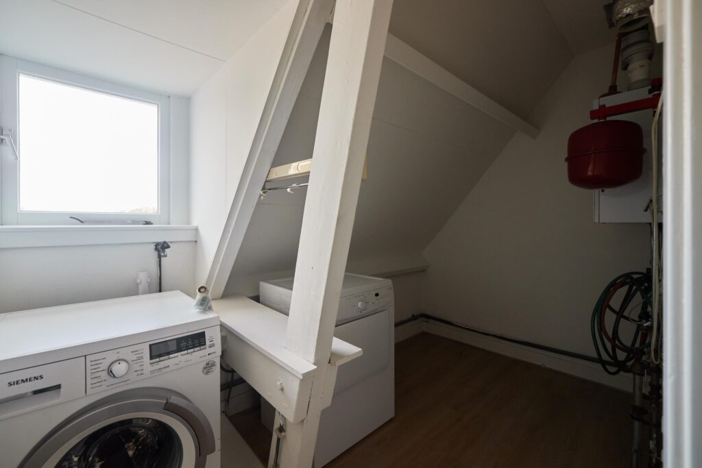 Tweede verdieping: Overloop met vlizotrap naar de zolder. Op deze verdieping bevinden zich drie slaapkamers, allen onder een sfeervol schuin dak. De masterbedroom beschikt over een praktische inbouwkast. De badkamer is voorzien van een tweede toilet, wastafelmeubel en douche. Naast de badkamer is een aparte wasruimte met aansluiting voor wasmachine en droger aanwezig.