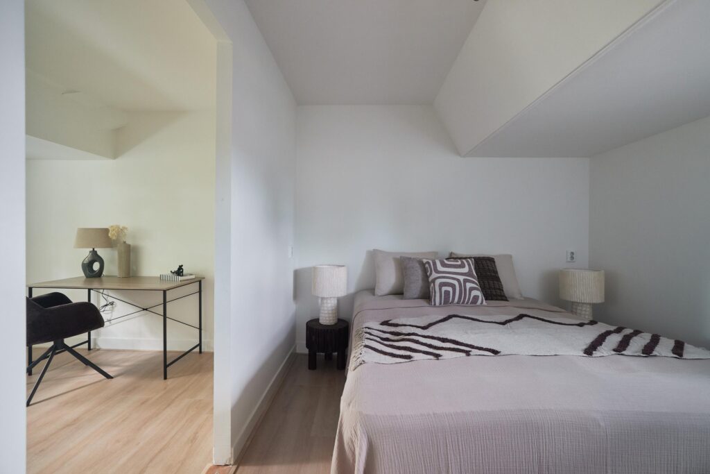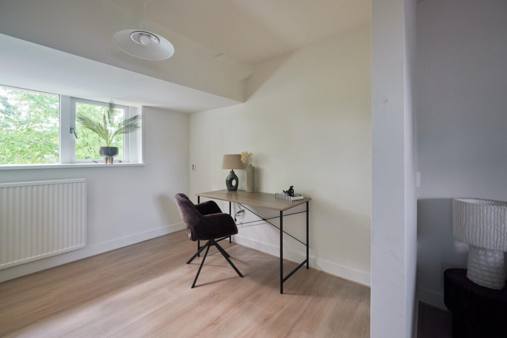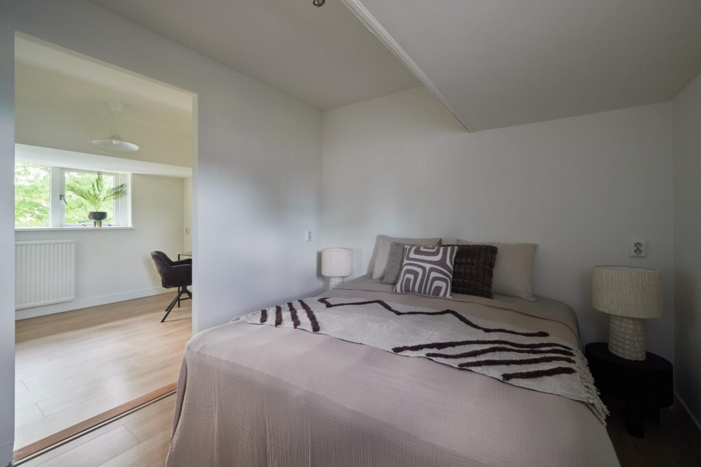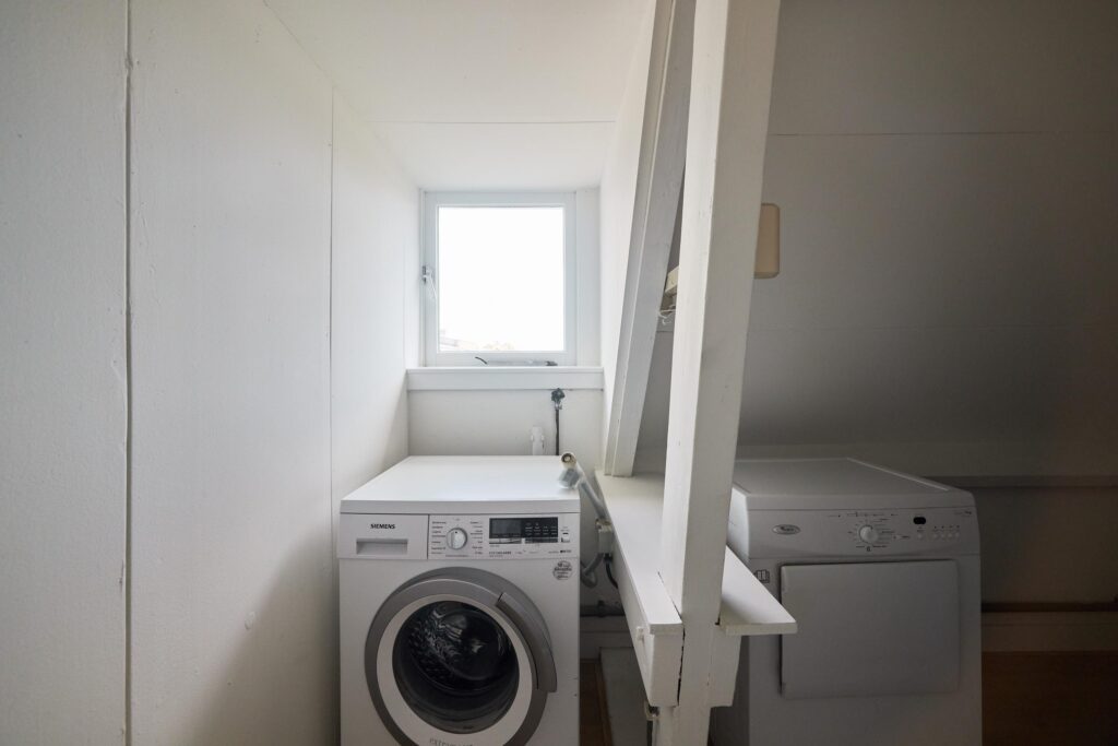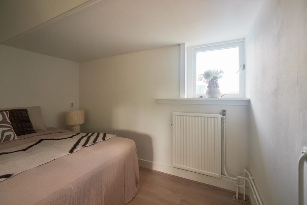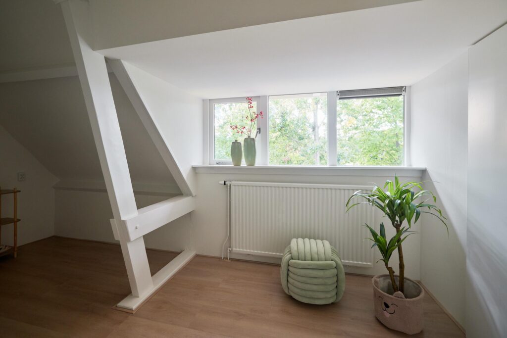 Tweede verdieping: Overloop met vlizotrap naar de zolder. Op deze verdieping bevinden zich drie slaapkamers, allen onder een sfeervol schuin dak. De masterbedroom beschikt over een praktische inbouwkast. De badkamer is voorzien van een tweede toilet, wastafelmeubel en douche. Naast de badkamer is een aparte wasruimte met aansluiting voor wasmachine en droger aanwezig.