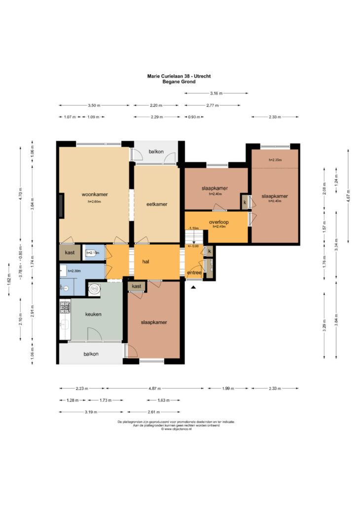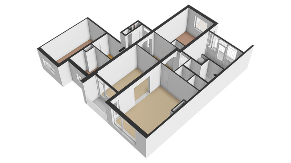 Appartement; Entree, hal met meterkast en inbouwkast. Links loopt de hal door naar diverse vertrekken, waaronder een slaapkamer met inbouwkast en toegang tot een balkon. Naast deze slaapkamer is de woonkeuken gesitueerd met tevens toegang tot het balkon. De keuken beschikt over diverse inbouwapparatuur, een t.v. scherm en een wasmachine-aansluiting. Naast de keuken ligt de badkamer welke voorzien is van een douche en een wastafelmeubel. Naast de badkamer is een afgesloten berging met ruimte voor de c.v. opstelling. De woonkamer heeft een inbouwkast, een schouw en heeft toegang tot het tweede balkon. Een opengebroken wand heeft doorloop naar de eetkamer dat tevens toegang biedt tot het tweede balkon. Weer terug naar de hal zijn enkele treden die leiden neer een overloop. Vanuit hier is er toegang tot twee slaapkamers, waarvan één met inbouwkast.