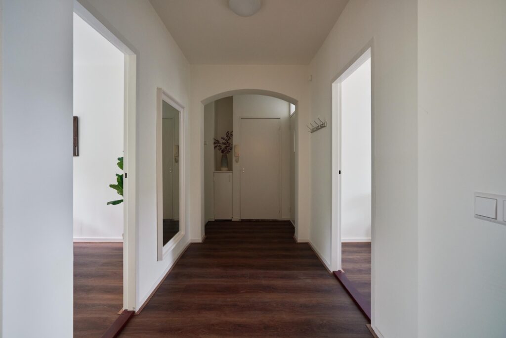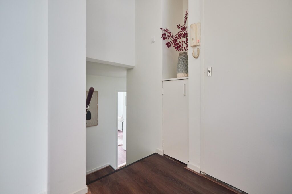 Appartement; Entree, hal met meterkast en inbouwkast. Links loopt de hal door naar diverse vertrekken, waaronder een slaapkamer met inbouwkast en toegang tot een balkon. Naast deze slaapkamer is de woonkeuken gesitueerd met tevens toegang tot het balkon. De keuken beschikt over diverse inbouwapparatuur, een t.v. scherm en een wasmachine-aansluiting. Naast de keuken ligt de badkamer welke voorzien is van een douche en een wastafelmeubel. Naast de badkamer is een afgesloten berging met ruimte voor de c.v. opstelling. De woonkamer heeft een inbouwkast, een schouw en heeft toegang tot het tweede balkon. Een opengebroken wand heeft doorloop naar de eetkamer dat tevens toegang biedt tot het tweede balkon. Weer terug naar de hal zijn enkele treden die leiden neer een overloop. Vanuit hier is er toegang tot twee slaapkamers, waarvan één met inbouwkast.