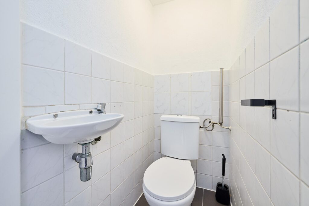 Naast de keuken ligt de badkamer, voorzien van een douche en een wastafelmeubel. Daarnaast bevindt zich een separaat toilet met fontein.