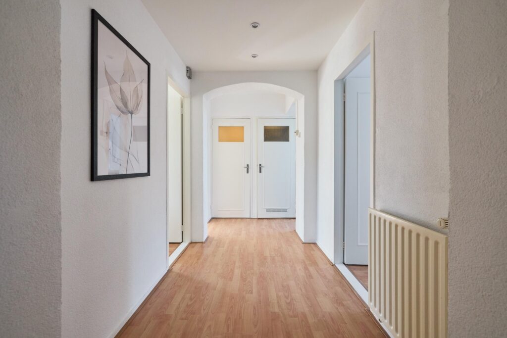 Appartement: Entree, hal met meterkast en inbouwkast. Rechts loopt de hal door naar diverse vertrekken, waaronder een slaapkamer met inbouwkast en toegang tot het eerste balkon. Naast deze slaapkamer bevindt zich de ruime keuken, eveneens met toegang tot het balkon. De keuken beschikt over diverse inbouwapparatuur en een aansluiting voor de wasmachine.