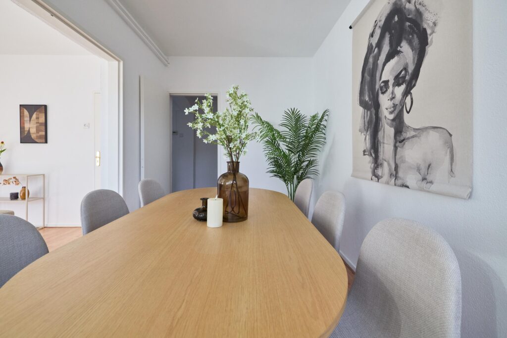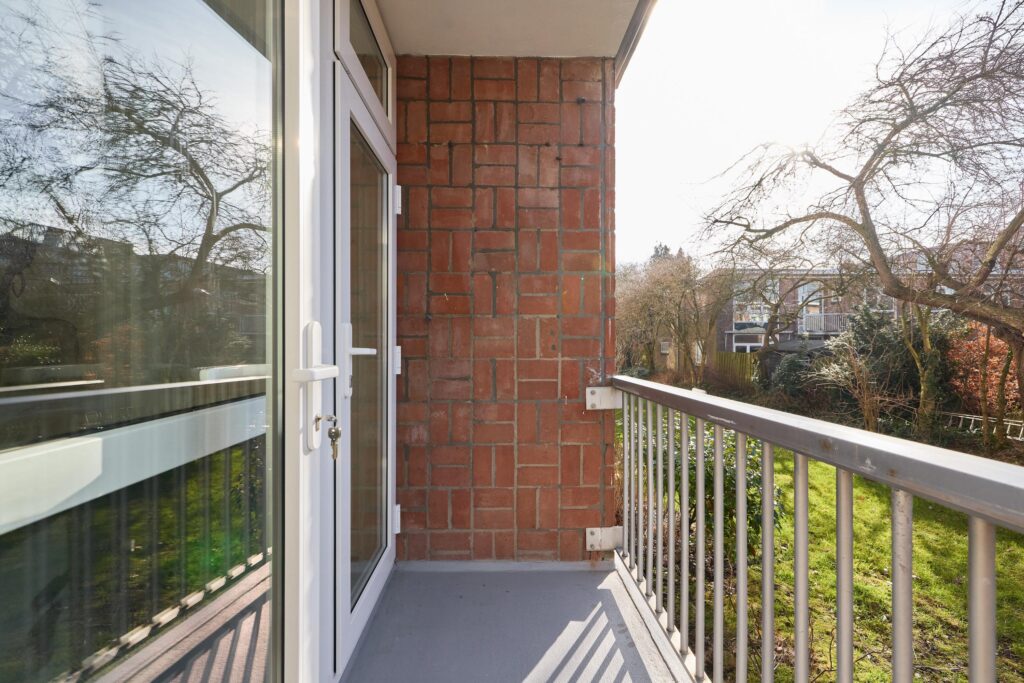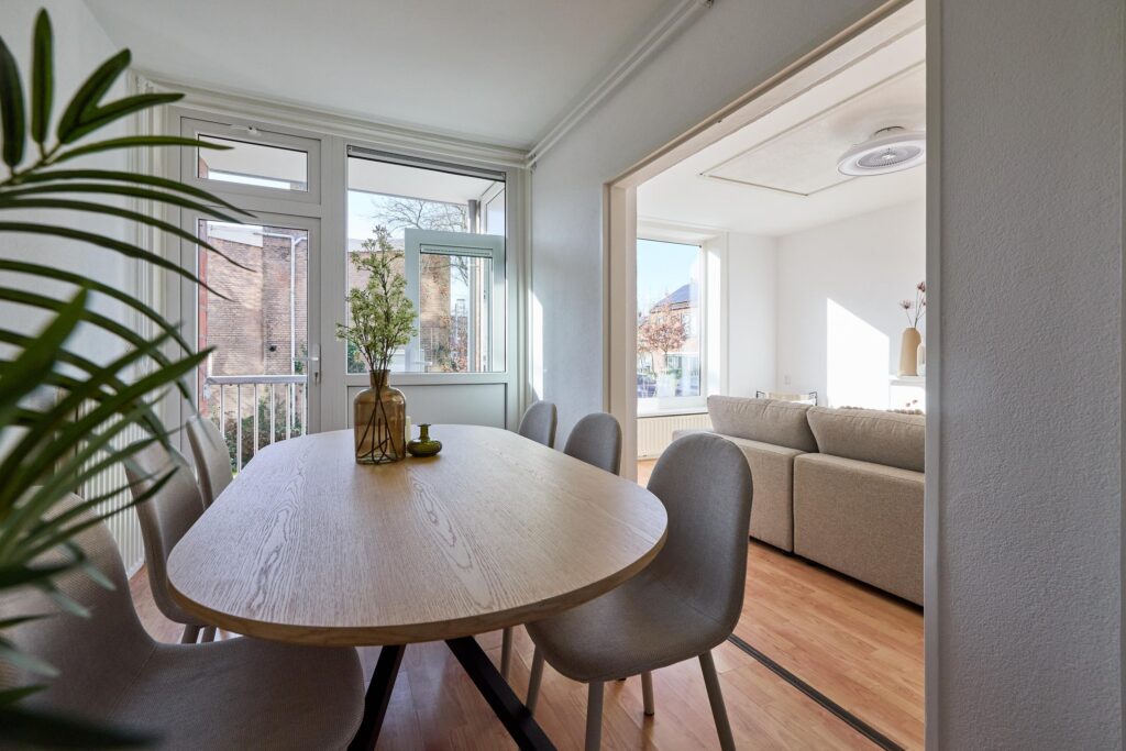 De woonkamer beschikt over een inbouwkast, een schouw en biedt toegang tot het tweede balkon. Een opengebroken wand zorgt voor een mooie doorloop naar de eetkamer, die eveneens toegang biedt tot dit balkon.